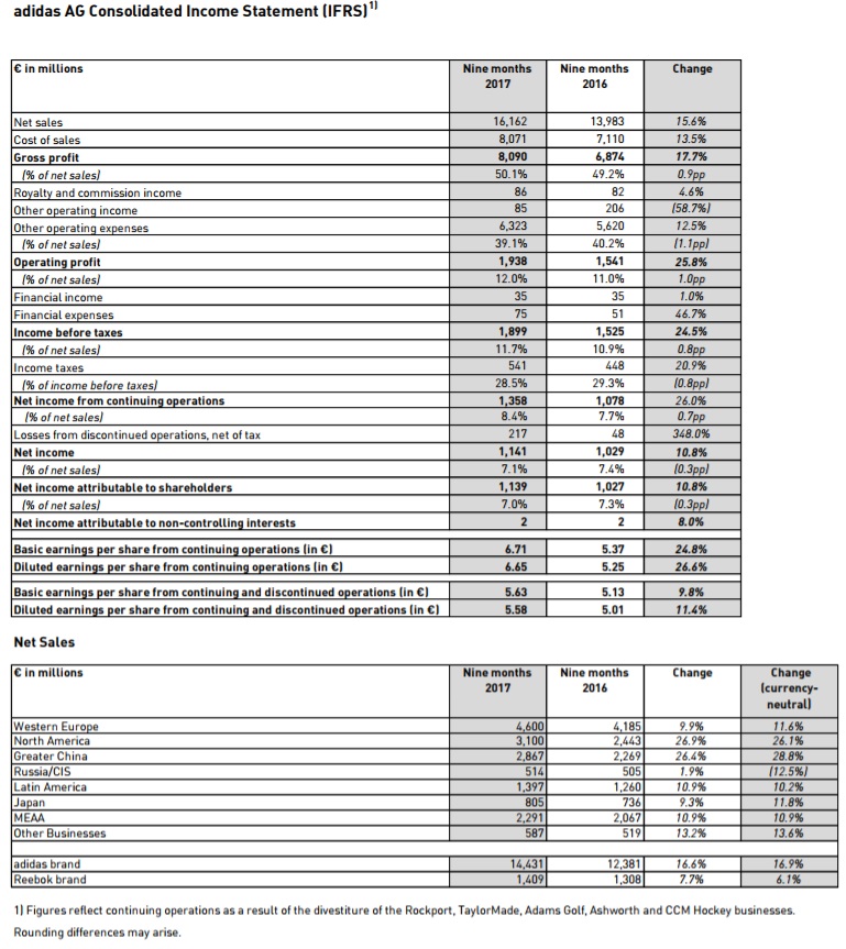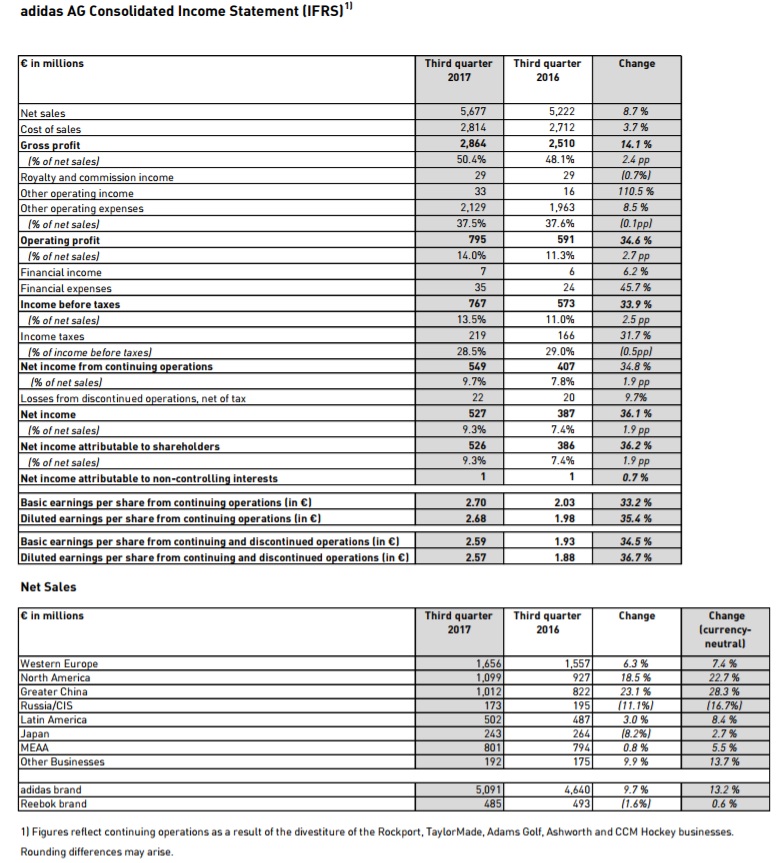 Aujourd’hui, adidas Group a communiqué ses résultats financiers pour le 3ème trimestre 2017. Les ventes ont augmenté de 8,7% par rapport à l’année dernière sur la même période pour atteindre 5,677 milliards d’euros. Le revenu net entre juillet et septembre s’élève à 527M€ et la marge gagne 2.4 points à 50.4%.