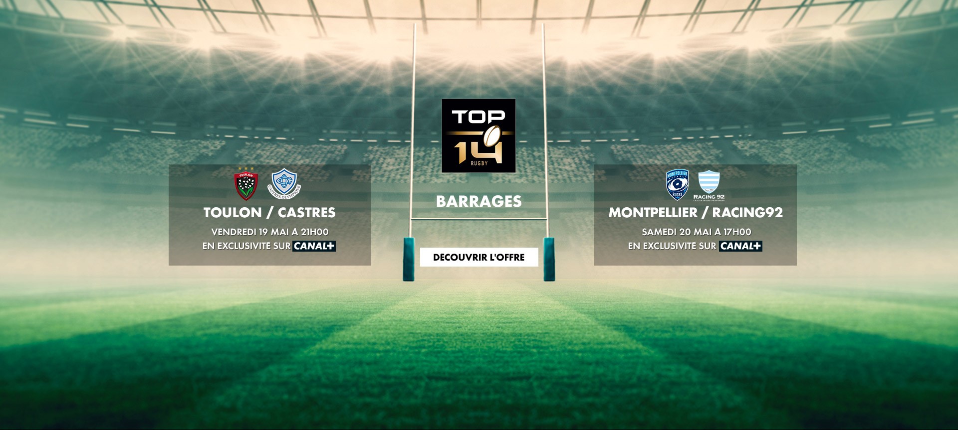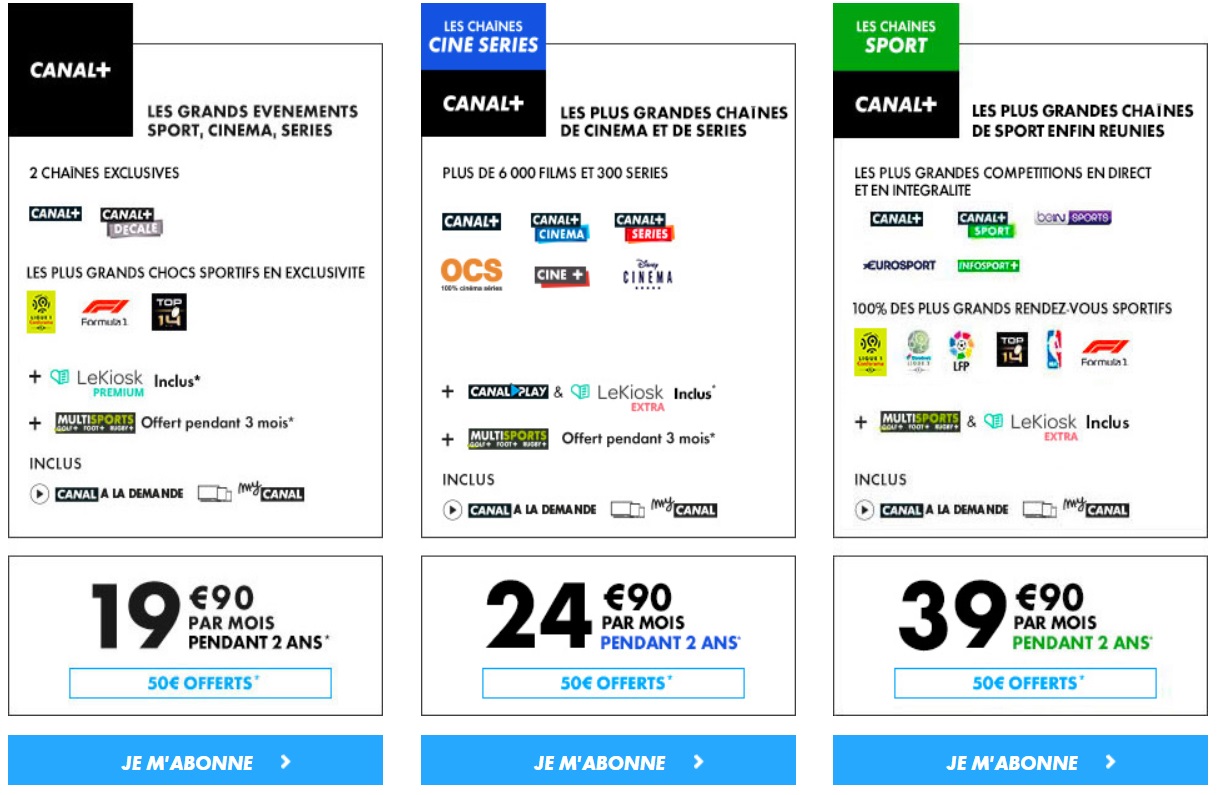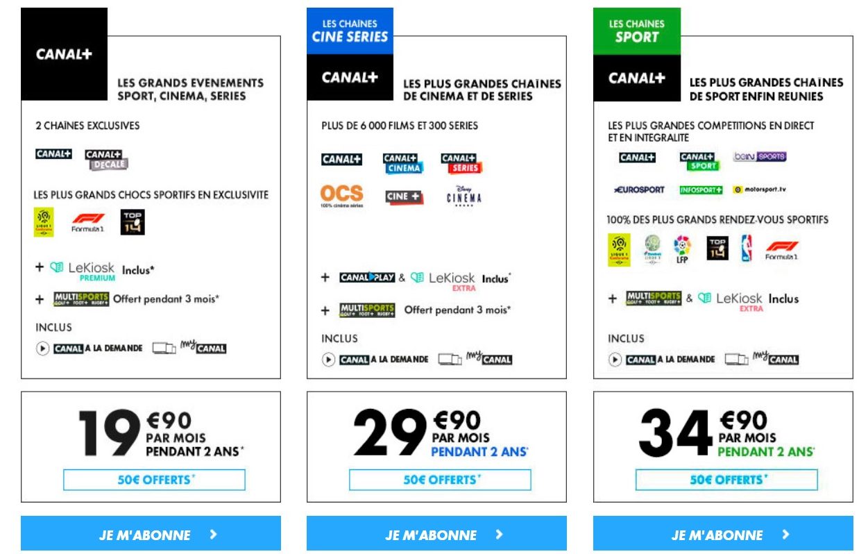 Découvrez l’offre 100% CANAL+ : vivez toute l’intensité du sport avec la Premier League, le TOP 14, la Formule 1®, le MotoGP™, ainsi que 100% des matchs de coupes d’Europe pendant 24 mois, sans oublier beIN SPORTS inclus 3 mois. Profitez aussi du meilleur du cinéma récent et des séries Création Originale CANAL+. Le tout pour seulement 19,99€/mois pendant 24 mois, puis 32,99€/mois… avec en bonus 50€ offerts !