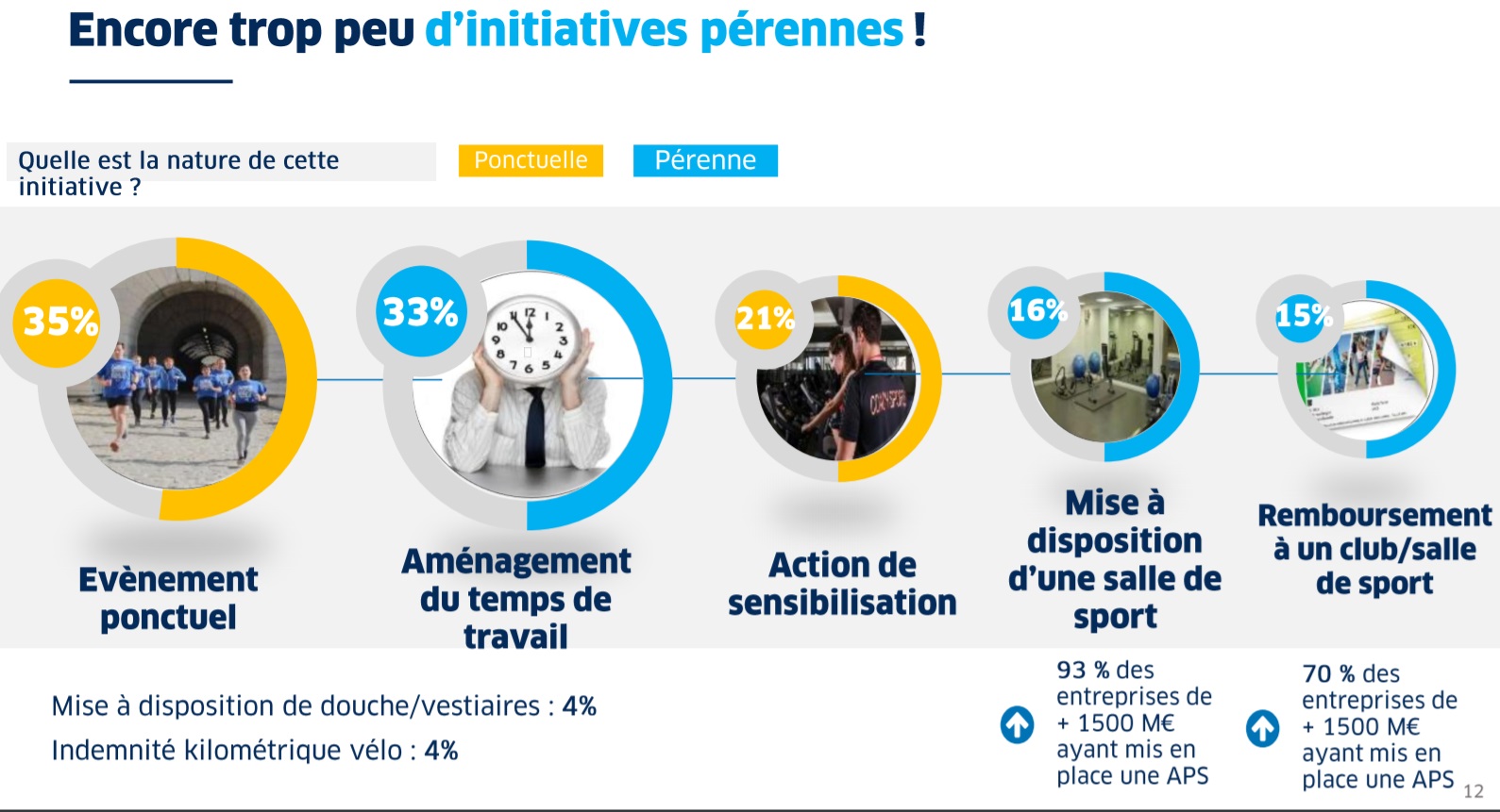 A ce jour, bien que 87% des chefs d’entreprises aient intégré la bienfaisance du sport sur leurs salariés, seuls 18% ont déjà mis en oeuvre des mesures visant à faciliter la pratique du sport. Pour la plupart des dirigeants, le frein principal reste la logistique engendrée par des installations au sein de l’entreprise. Autre raison du manque d’engagement des structures : la méconnaissance des solutions et des accompagnements disponibles pour mettre en place des solutions profitant à tous.