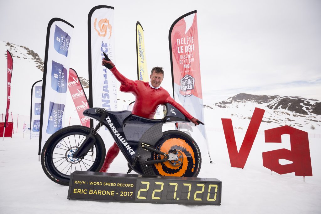 C’est à 7h40 le 18 Mars sur la station de Vars, que s’est élancé Éric Barone du haut de la piste Chabrière pour battre son propre record de vitesse en VTT sur neige avec une vitesse de 227,72 km/h (4 km/h de plus que son précédent record).