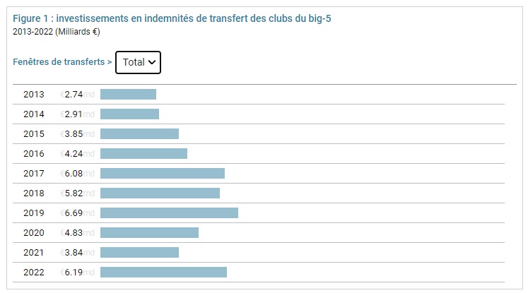 Selon le CIES, les achats de joueurs sont repartis à la hausse cet été et l’hiver dernier avec un total de 6,19 milliards d’euros dépensés en 2022 en indemnités de transferts par le BIG-5. Un chiffre qui est essentiellement constitué des dépenses des clubs anglais qui ont investi cette année quelques 3 milliards d’euros sur le marché des transferts.