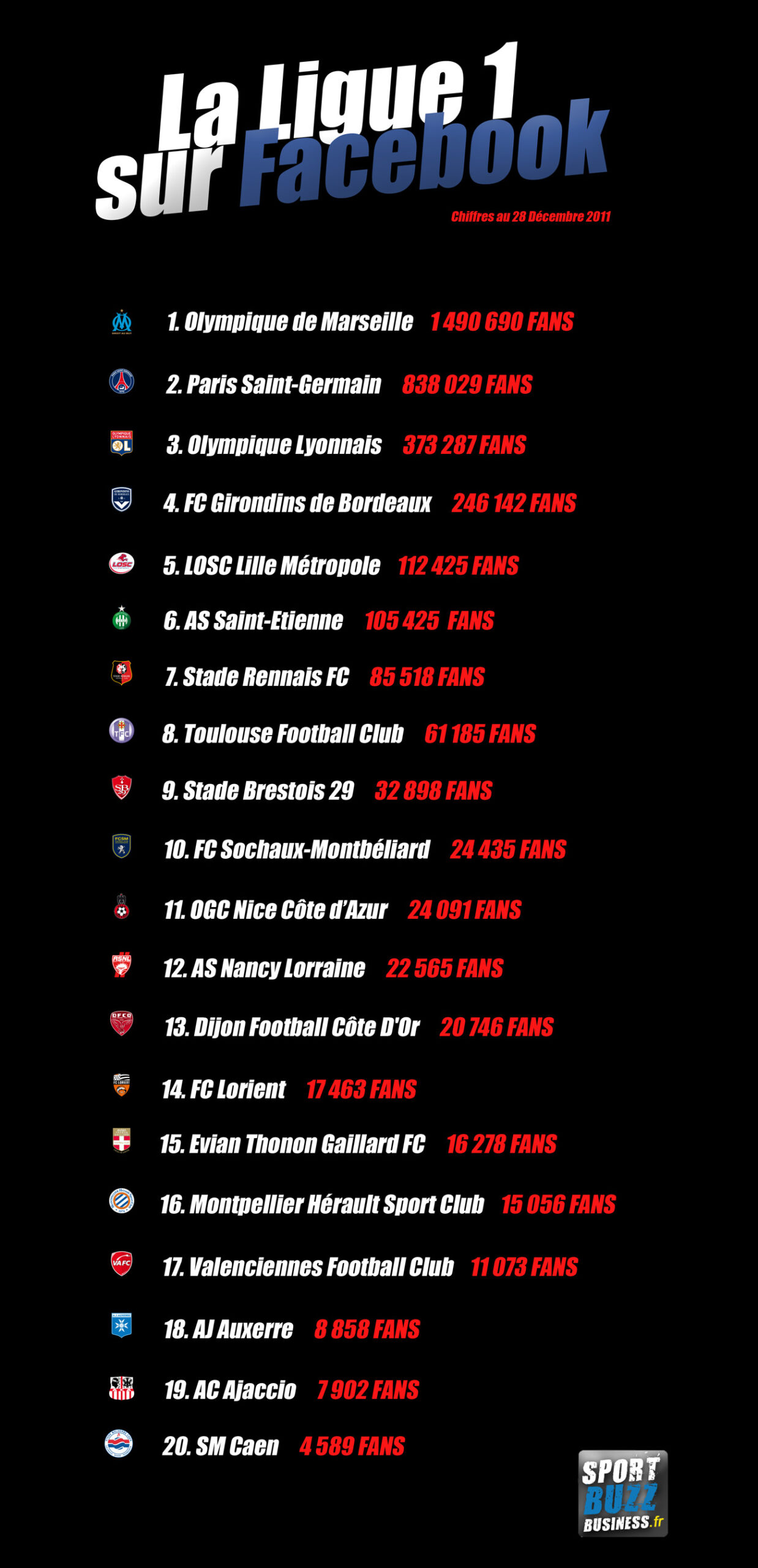 L’Olympique de Marseille est le club de Ligue 1 le plus populaire sur Facebook en 2011! Ce résultat n’est pas vraiment surprenant en soit. L’OM comptabilise 1 490 690 fans sur sa page officielle, soit presque 2x plus que le Paris Saint-Germain, second du classement avec 838 029 fans ! Le 3ème club le plus populaire de la Ligue 1 sur Facebook est l’Olympique Lyonnais avec un total de 373 287 fans. La totalité des clubs de Ligue 1 regroupe 3 282 157 « like ». A lui seul, l’Olympique de Marseille représente plus de 45% des fans Facebook des clubs de Ligue 1. Chapeau. (SportBuzzBusiness.fr est sur Facebook. Rejoignez-nous !)