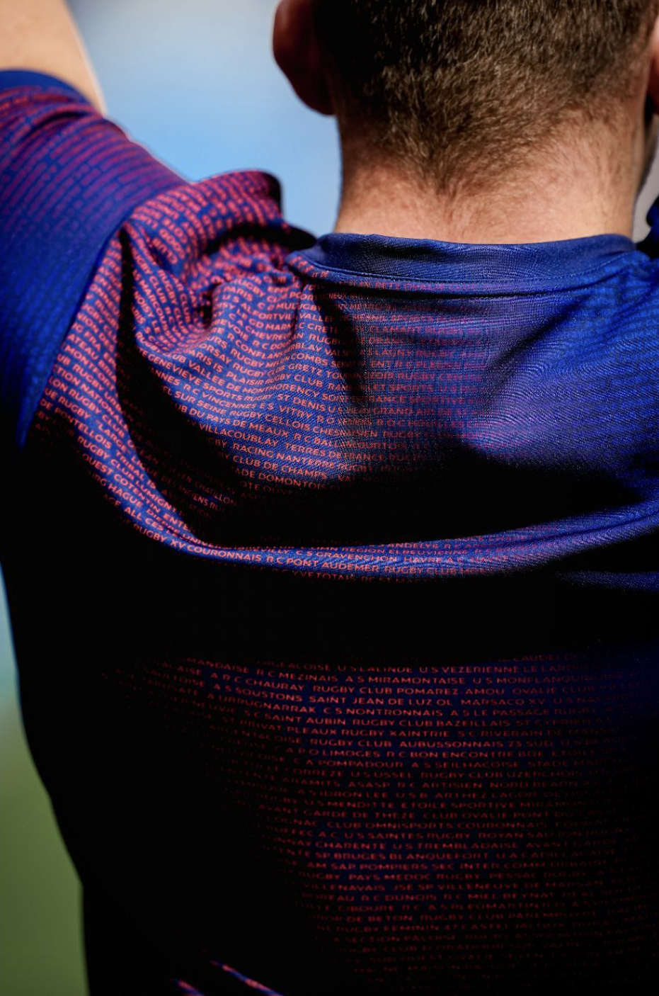 Sur le maillot d’échauffement d’avant-match du XV de France figure le nom des 1 946 clubs de rugby amateurs français.