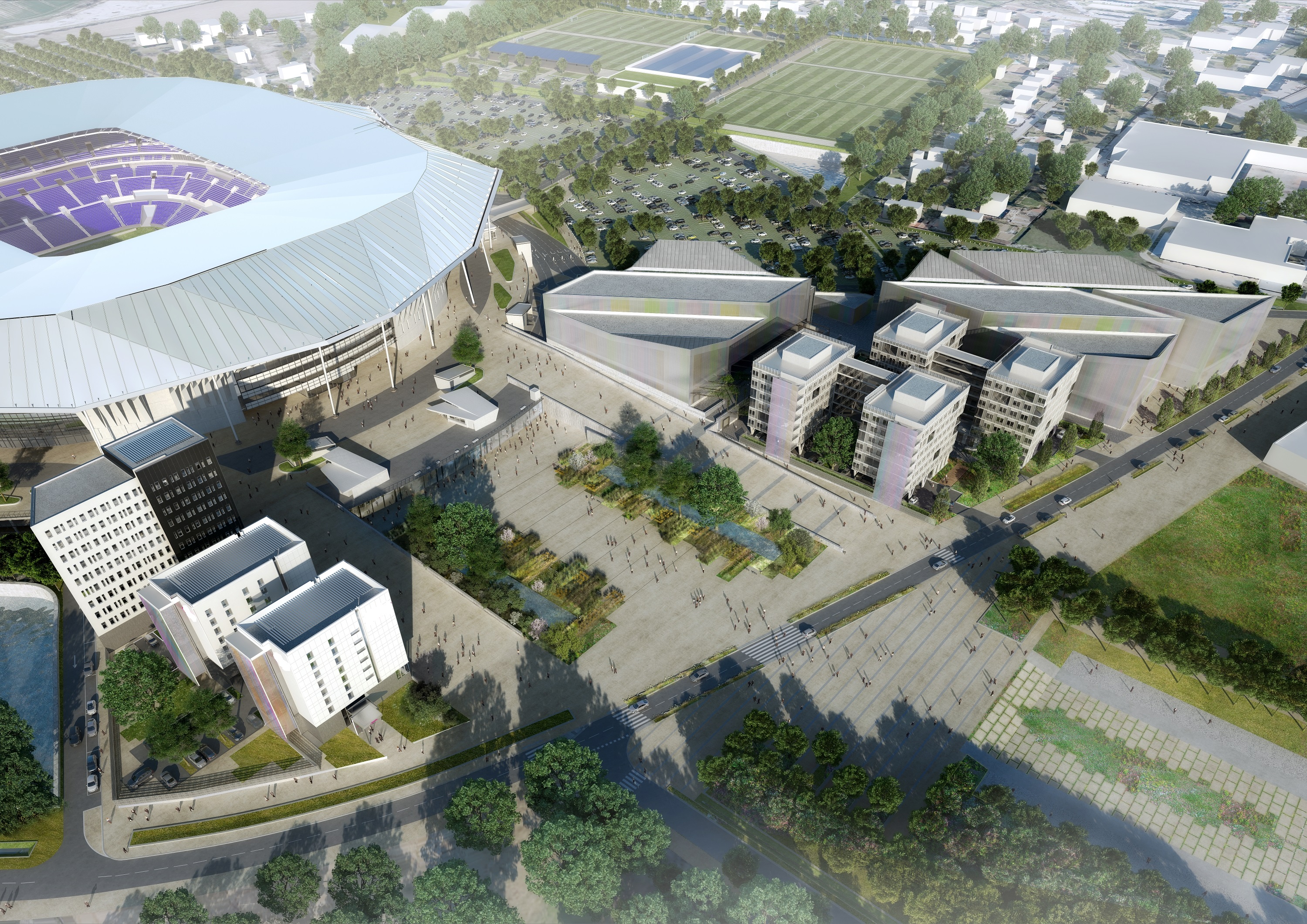 Le coup d’envoi médiatique est donné pour le lancement des travaux de ce pôle de loisirs situé à proximité du Groupama Stadium, l’enceinte propriété de l’OL. Le futur lieu de vie sera composé de quatre bâtiments représentant une surface de 23 000 m2. La conception a été confiée à l’architecte Bruno Dumetier.