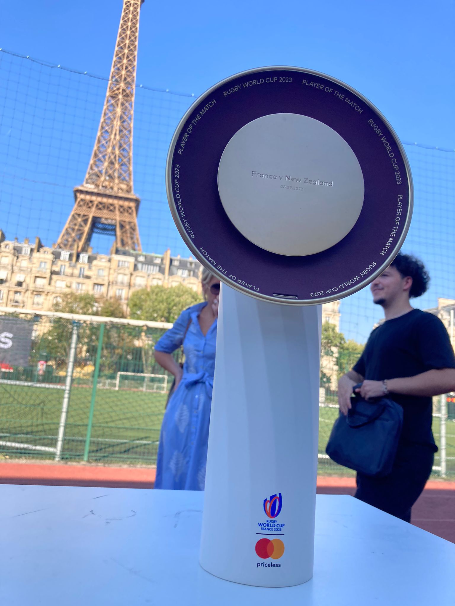 Le trophée d’homme du match a une forme d’enceinte pour propager le son. Avec ce trophée, on a vraiment voulu représenter la France. On a donc utilisé de la céramique et du cuir de grandes maisons. Un ruban avec le nom du meilleur joueur du match sera ajouté au trophée. Mastercard a organisé un concours pour qu’un de ses porteurs de carte remette ce trophée à la fin du match France Namibie. Le gagnant est déjà connu et en plus d’avoir gagné des places, il aura donc un accès à la pelouse. La particularité c’est que chaque trophée sera unique grâce aux différents sons.