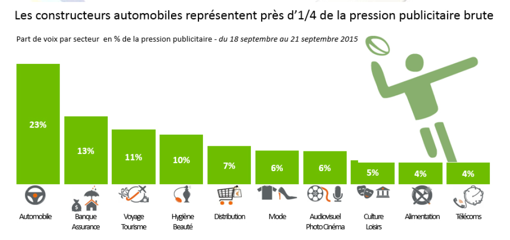 Pour les 8 premiers matchs, ce sont 87 annonceurs qui ont pointé le bout de leur nez sur les écrans publicitaires pour un montant brut de 14,1 millions d’euros. 14 constructeurs automobiles ont acheté de l’espace pour faire du secteur automobile le plus présent avec 23% de part de voix. Kantar Media précise cependant que c’est la Société Générale, Partenaire Officiel de la compétition, qui s’est offert le spot le plus coûteux (avant remise et négociation) à la mi-temps du match France – Italie. Sur le papier, le spot le plus élevé est proposé à 250 000€ sur TF1 et placé entre les hymnes et le coup d’envoi pour la Finale en cas de présence du XV de France.