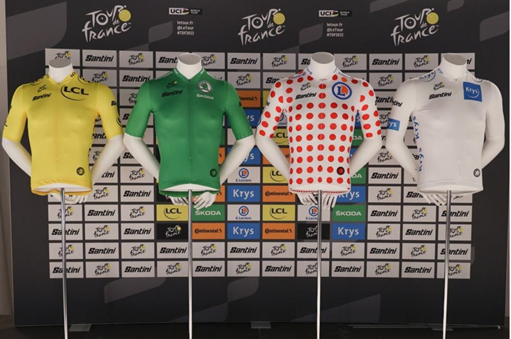 A l’occasion de la présentation du parcours du Tour de France 2022, A.S.O. a dévoilé les maillots de leaders conçus par le nouvel équipementier italien Santini.