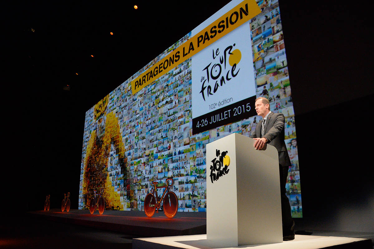 Hier, les organisateurs du Tour de France et son directeur Christian Prudhomme ont dévoilé les contours du Tour de France 2015 – dont le look du Maillot Jaune – lors d’une présentation organisée au Palais des Congrès de Paris en présence de plus de 4000 spectateurs. Pour cette 102e édition, les Fans de la Grande Boucle vont pouvoir participer à un concours leur offrant la possibilité d’être présent sur l’affiche officielle du Tour de France 2015. En effet, le visuel sera conçu à partir de milliers de photos de Fans façon mosaïque.