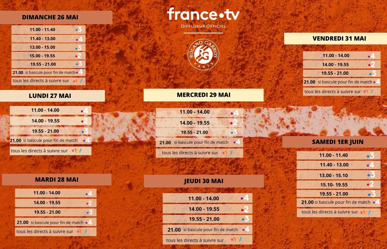Outre les diffusions en direct, l’émission « Tout le Sport » sera présentée par Cécile Grès et Claire Vocquier à 20h sur France 3 en direct depuis la terrasse du Chatrier.