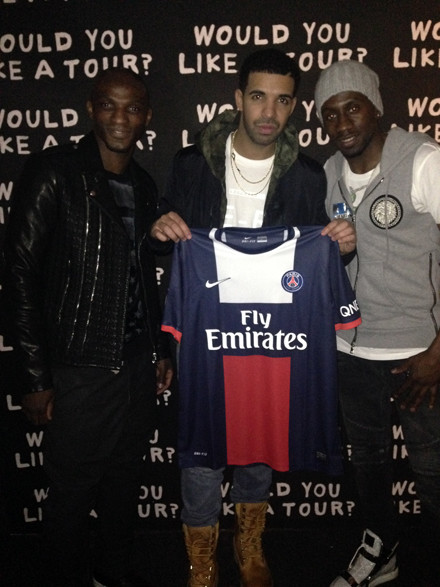 En concert à Bercy en ce début de semaine, le rappeur canadien Drake, récent Ambassadeur de la franchise NBA des Toronto Raptors, s’est vu offrir hier un maillot Nike du Paris Saint-Germain, floqué à son nom, des mains du défenseur Zoumana Camara et du milieu de terrain Blaise Matuidi venus assister à son show. Les trois hommes ont évidemment posé pour une photo souvenir qui veut montrer, si besoin est, de la dimension internationale prise par le PSG. Précisons que le rappeur Drake est également ambassadeur de la marque Jordan, propriété de l’américain Nike, sponsor du PSG qui a prolongé son partenariat avec le club de la capitale jusqu’en 2022.