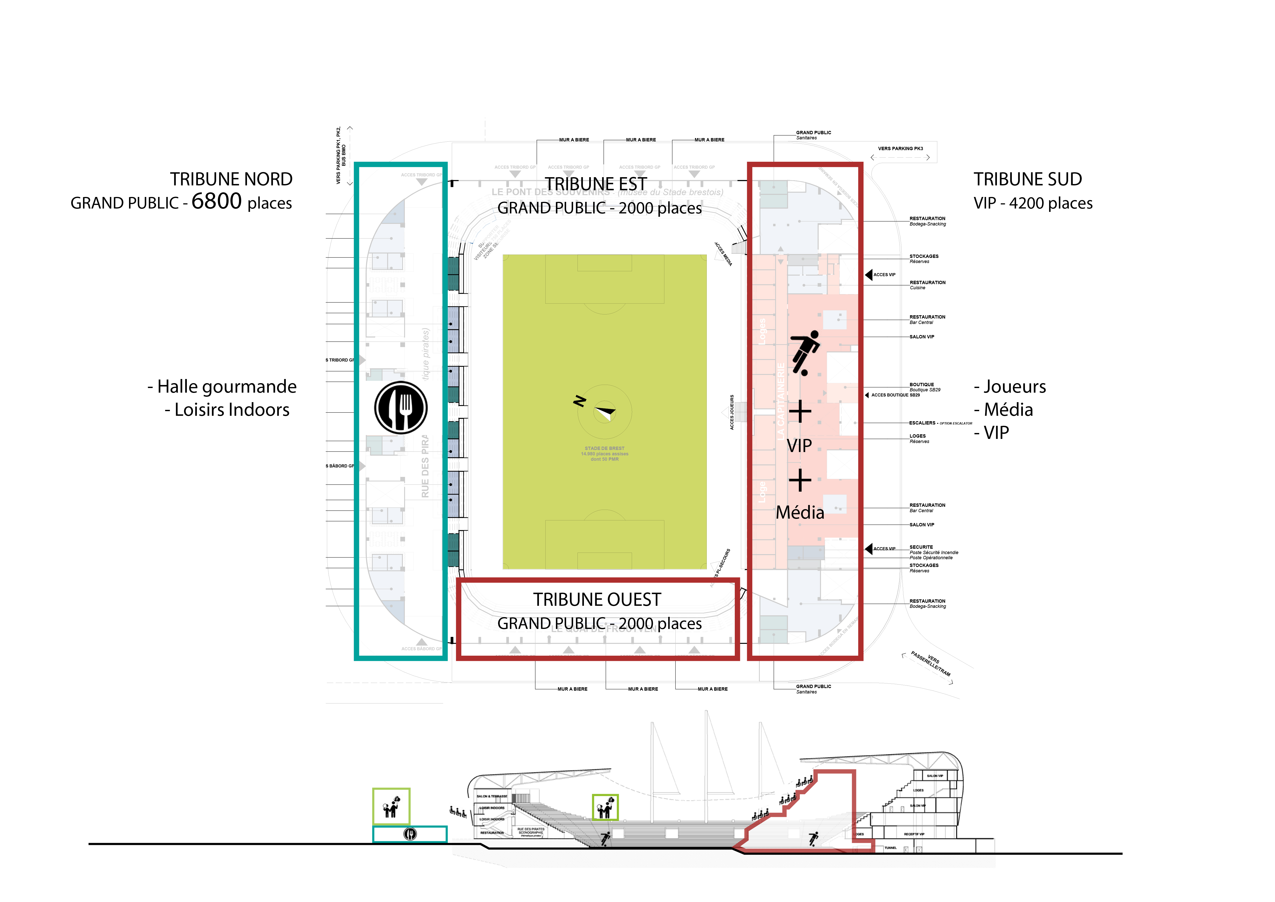 En revanche, contrairement aux grosses écuries du championnat, Brest s’apprête à construire un « stade raisonné et accueillant, pour permettre au club de s’installer durablement dans l’élite du football français« . Ce nouvel outil pourra accueillir jusqu’à 15 000 personnes, 10 800 places étant réservées au grand public.