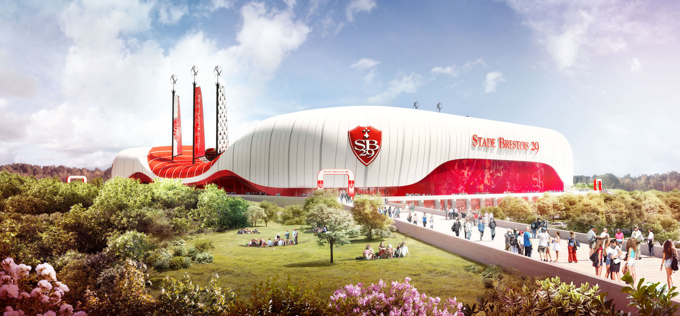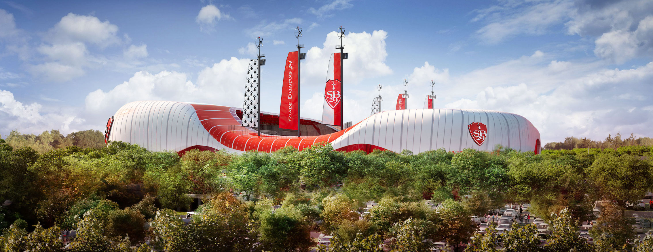 « Avec 6 accro-mâts de plus de 40 mètres de haut et ses voiles hissées aux couleurs du club, l’architecture est baignée par la culture maritime bretonne. Une initiative unique en France qui permettrait à l’enceinte d’être clairement identifiable, aux quatre coins du monde. Nul ne pourrait qu’ici c’est Brest », ajoute François de la Serre.