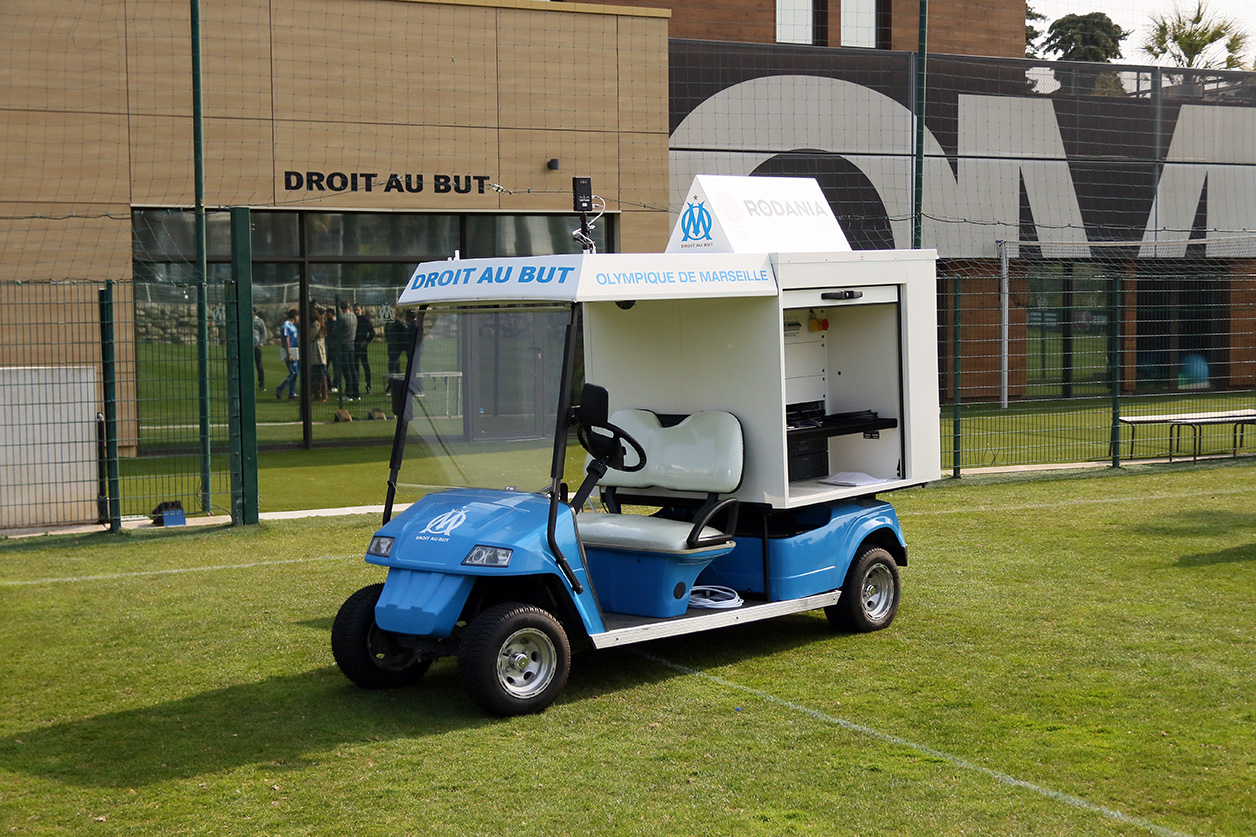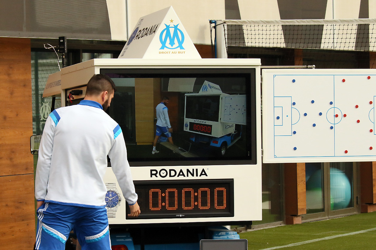 Le cube technologique, installé sur une voiturette de golf pour être au plus près du coach et des joueurs pendant les séances d’entraînements, propose un écran plein jour (tactile dans le futur) à l’arrière et est équipé d’une caméra HD pour filmer les séances. Son poids est de 432 kilos et a une autonomie de 147 minutes. Un outil capable de rediffuser instantanément les images filmées. « Bielsa souhaitait avoir des ressources technologiques pour travailler en temps réel » assure Corinne Gensollen, directrice marketing de l’OM. « Les équipes d’OM TV on travaillé sur le concept et nous l’avons proposé à notre partenaire Rodania. »