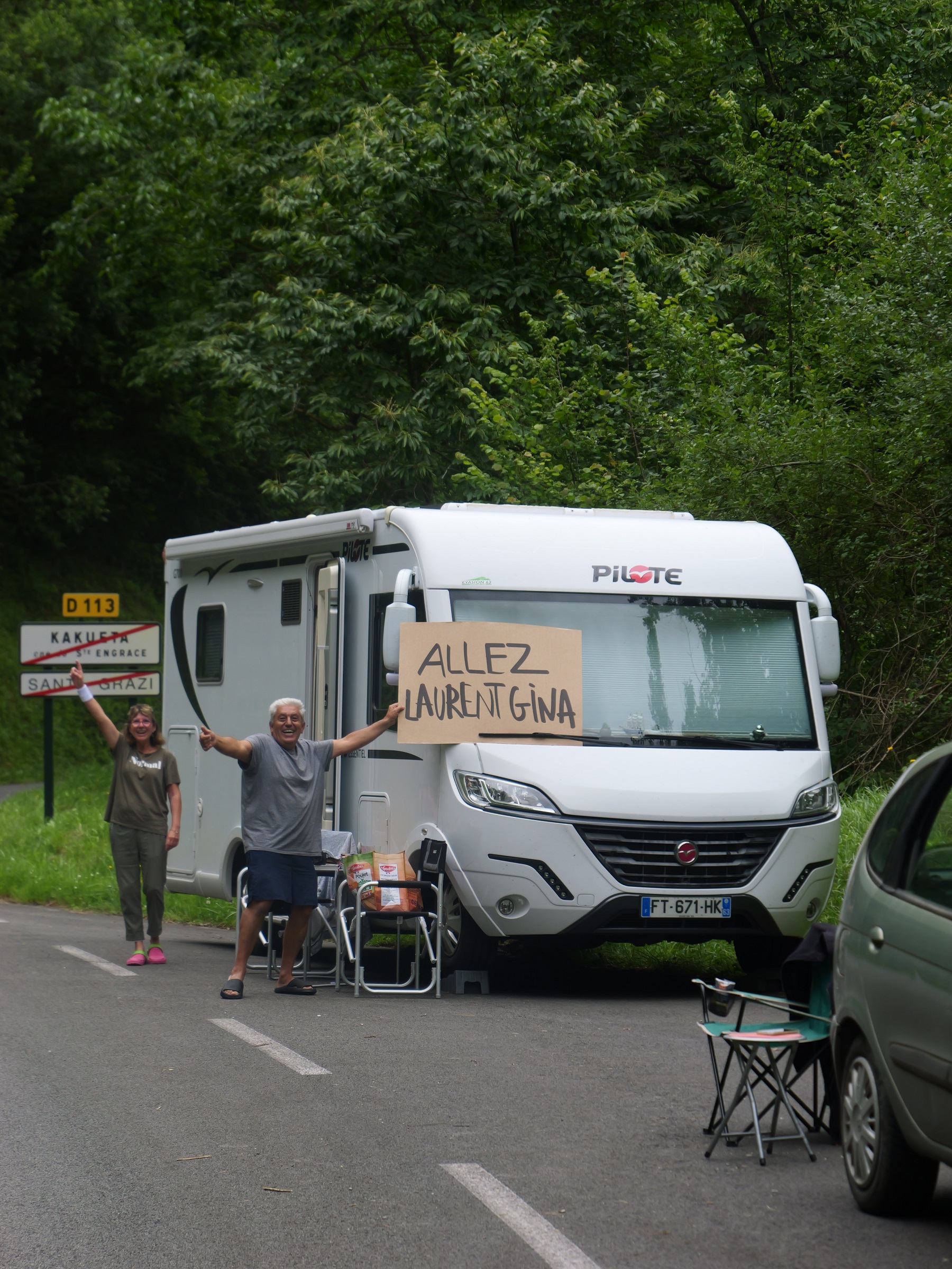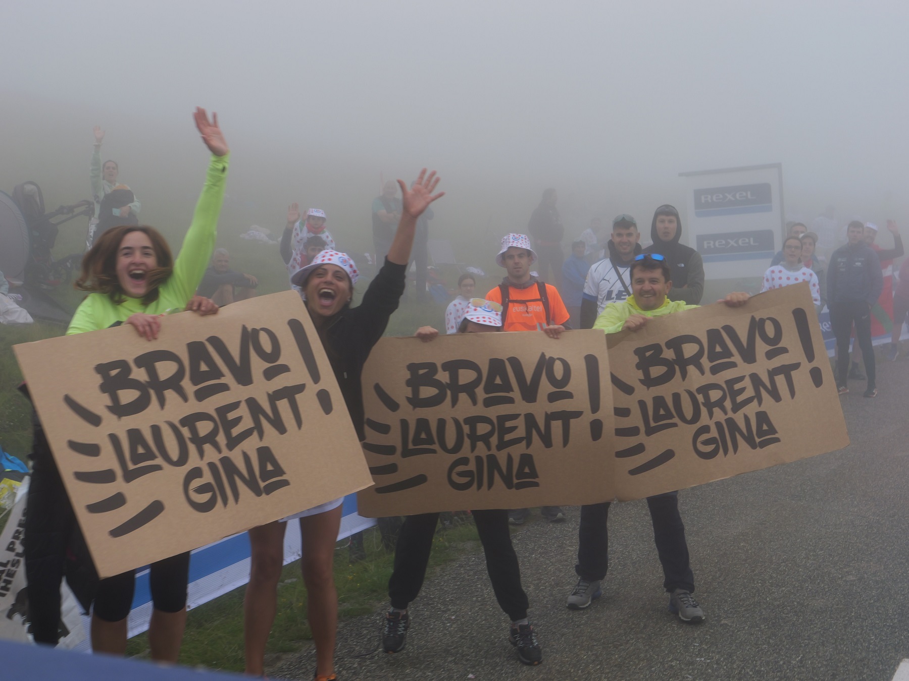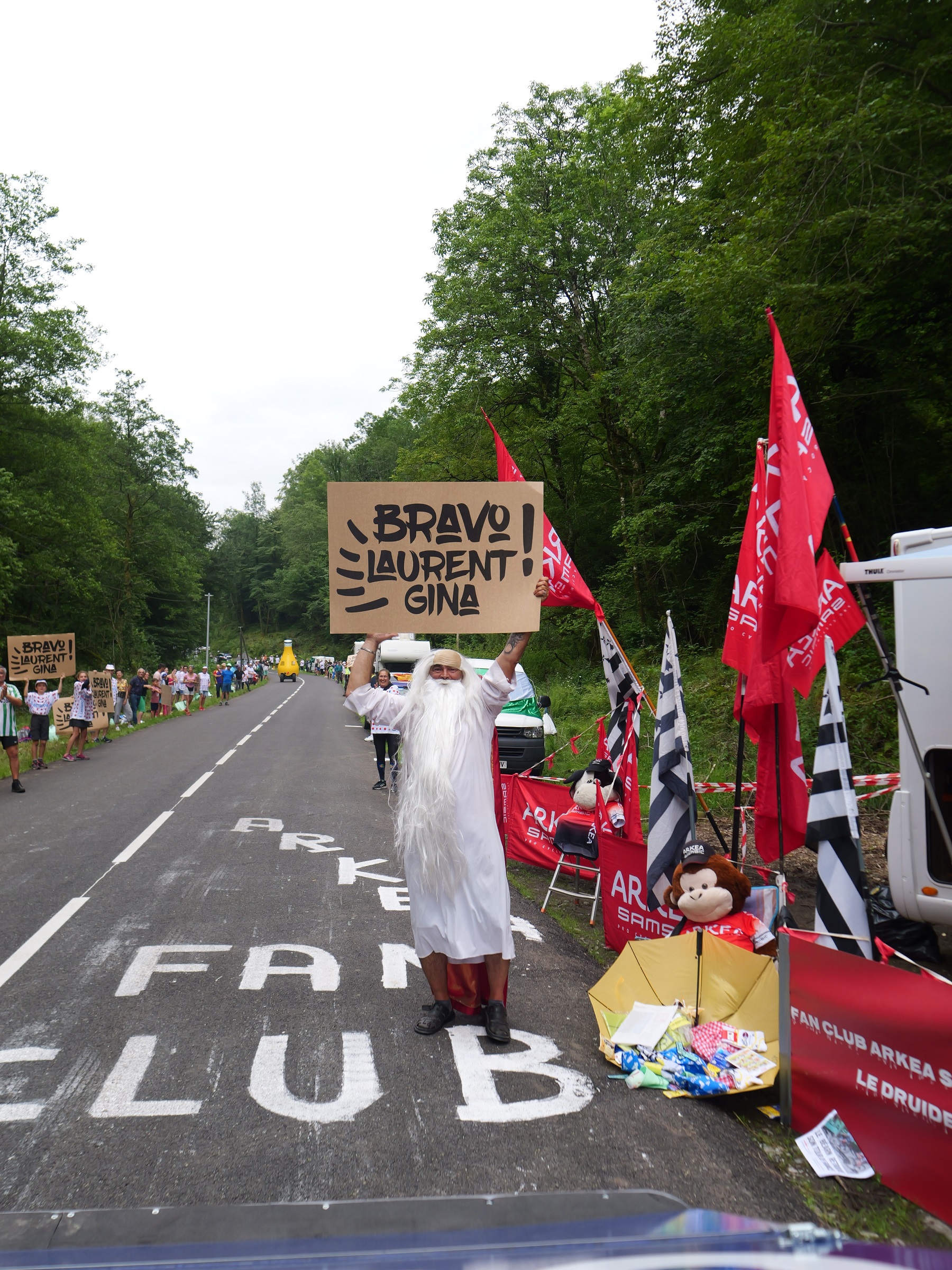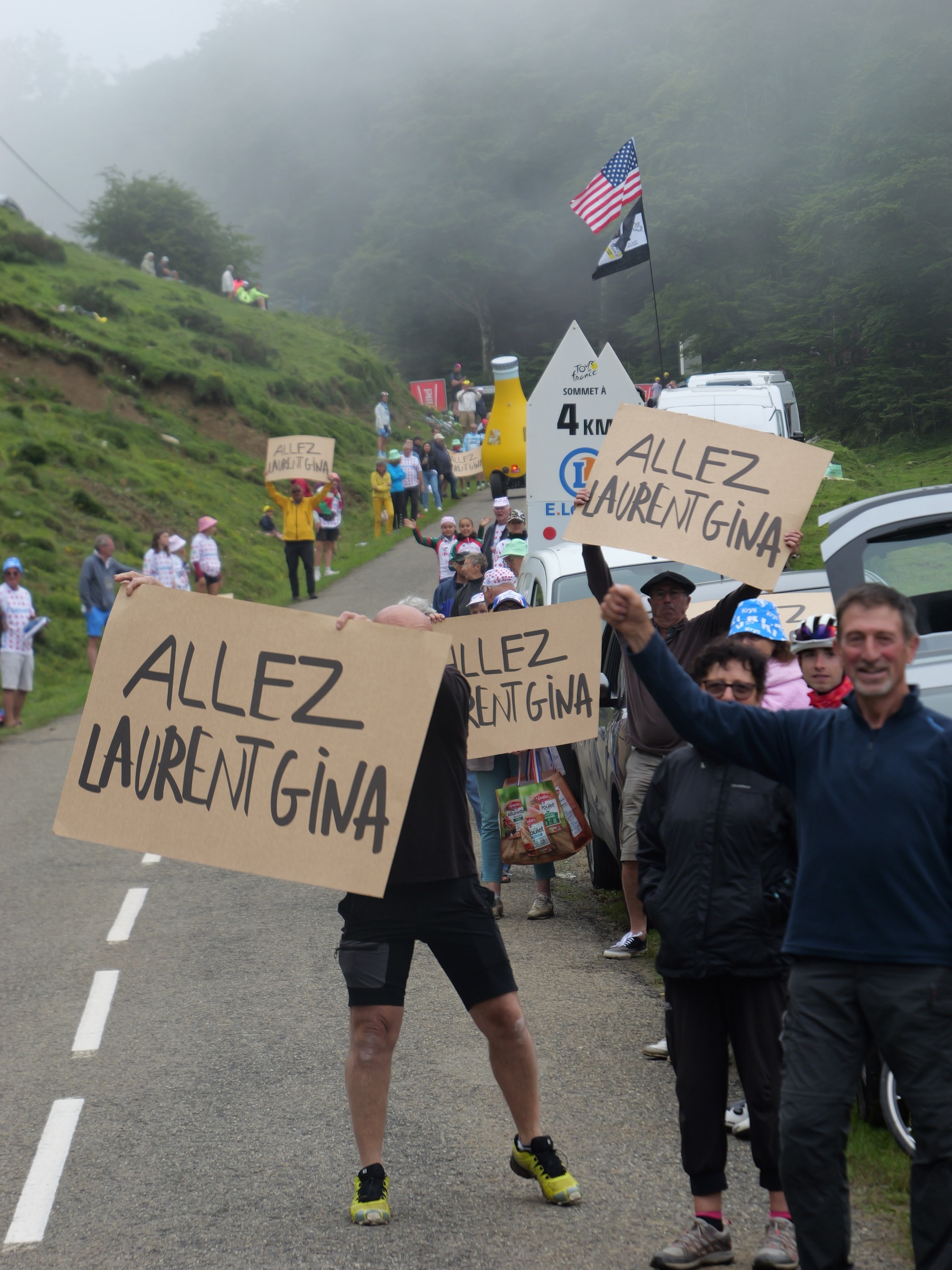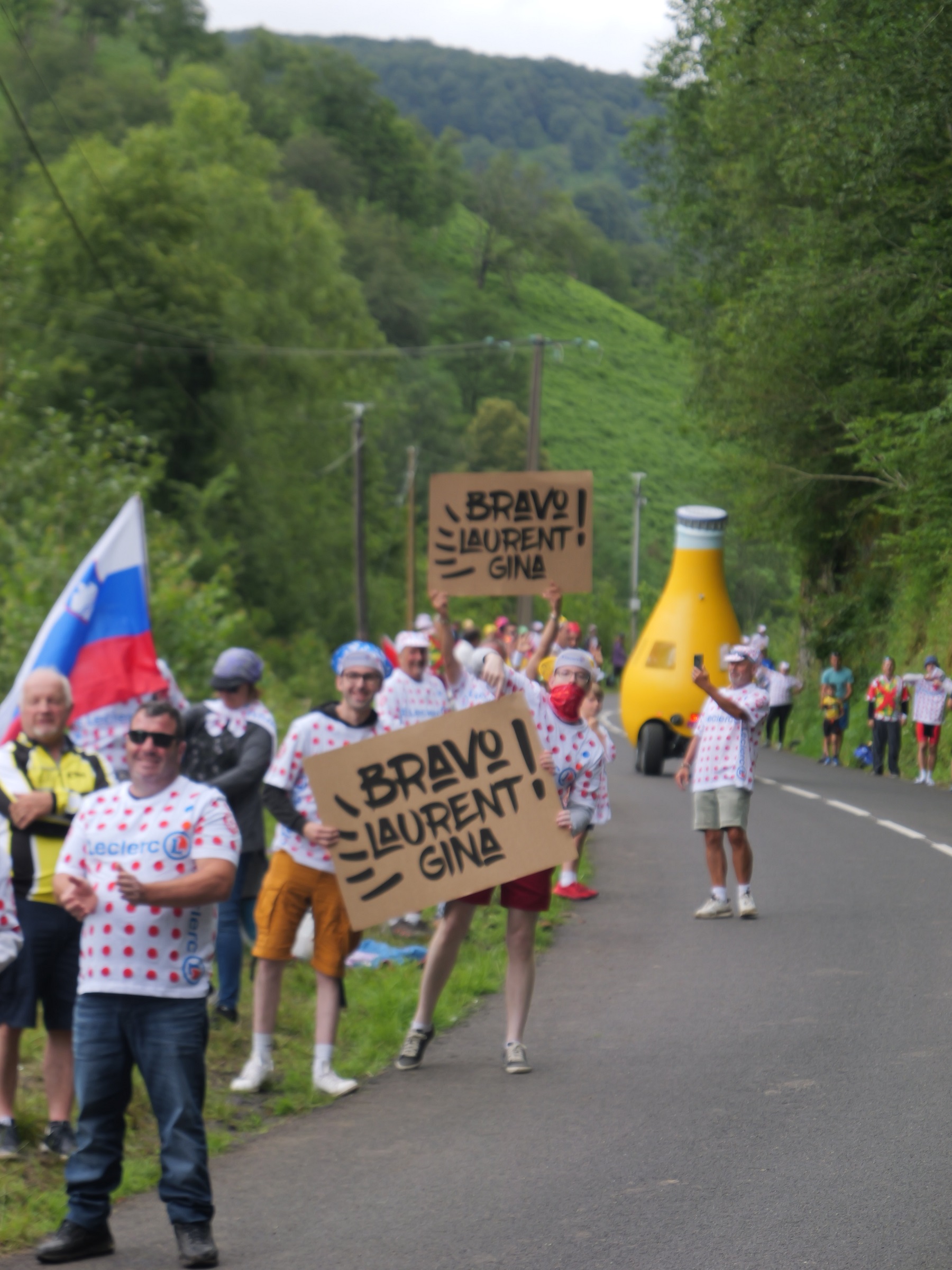 En amont du passage de la caravane publicitaire, Orangina distribue en nombre les fameuses pancartes. L’occasion de marquer son territoire sur le bord des routes et de tenter d’obtenir une visibilité lors des retransmissions TV de la course.