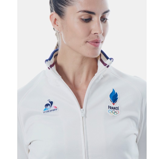 La tenue de podium est réalisée dans une matière particulière et « attire l’œil, grâce à sa légère brillance, qui mettra en lumière le talent de nos médaillés » explique Le Coq Sportif.