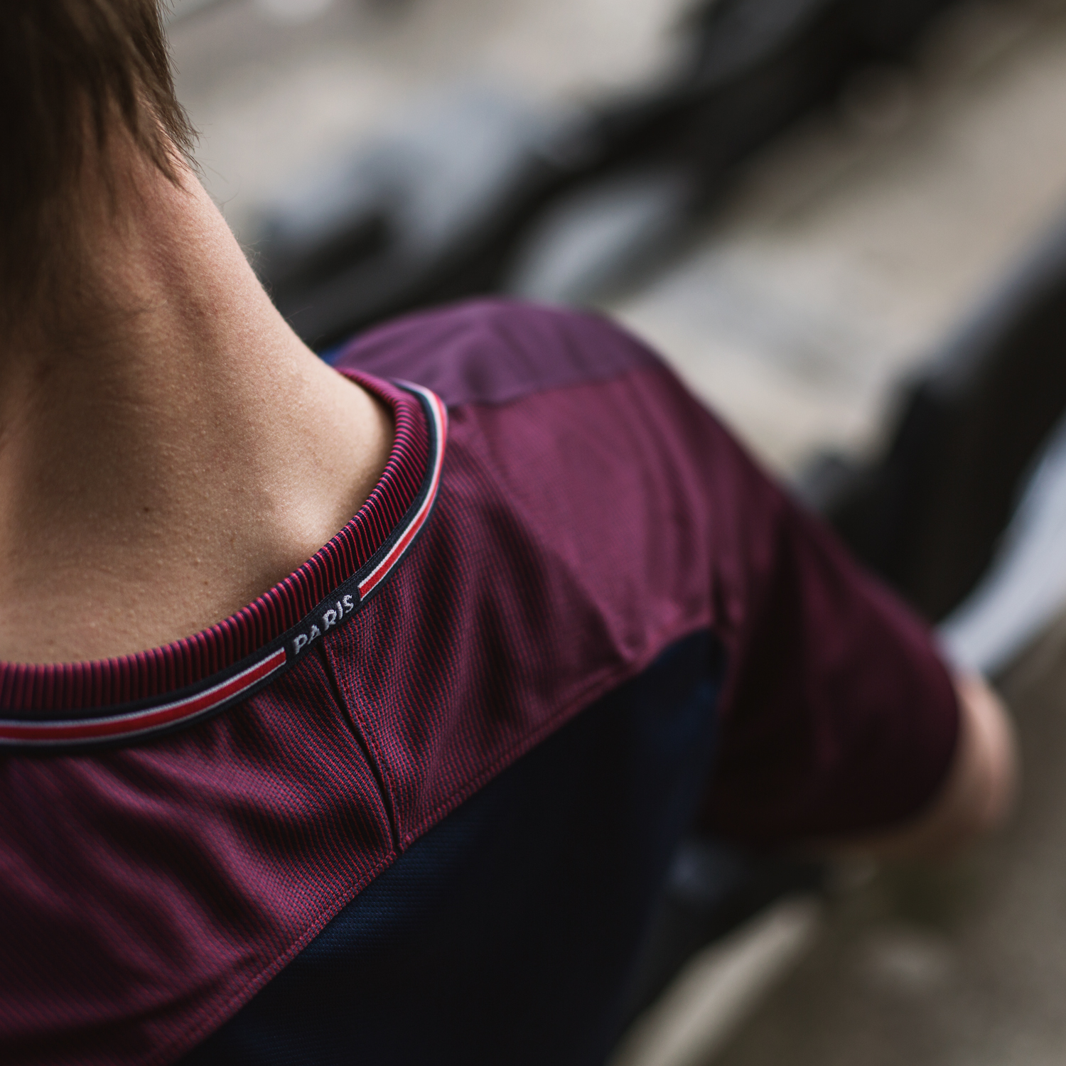Dans le détail, le nouveau maillot Home arbore un bleu nuit sur la face avant et arrière. Les épaules et les manches sont « rouges-mauves ». Sur le devant, une fine ligne rouge verticale constituée de chevrons linéaires viens habiller la tenue, partant du col jusqu’au bas du maillot.