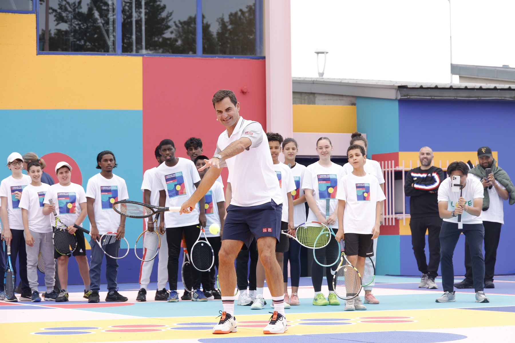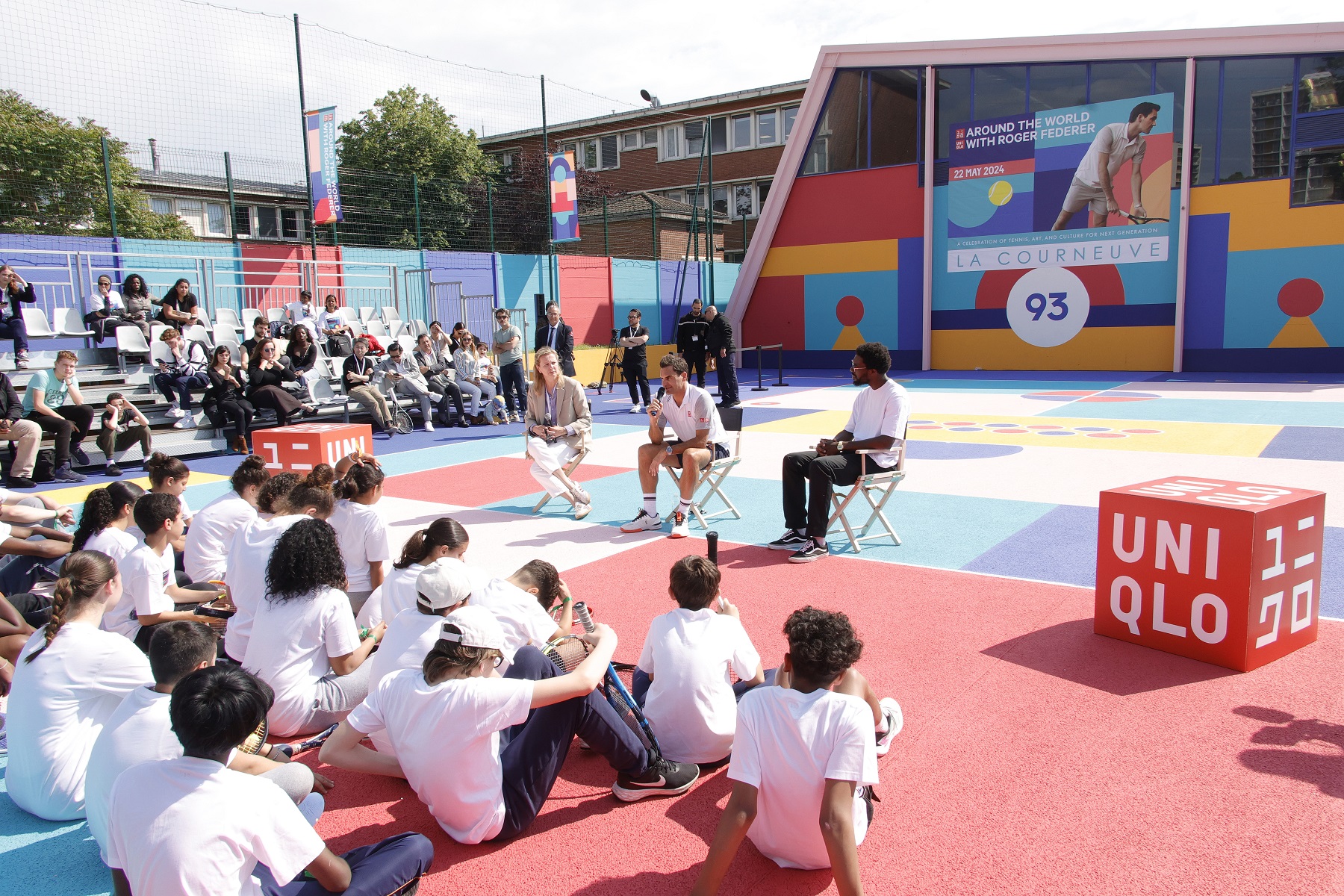 Ce mercredi, Uniqlo a ainsi convié Roger Federer à un évènement organisé dans une école de La Courneuve, ville située en Seine Saint-Denis. L’occasion pour la légende d’échanger avec de nombreux enfants et d’encadrer une séance d’entraînement. Uniqlo a ainsi aménagé un terrain offert à la ville avec une œuvre signée de Caroline Derveaux. Un terrain désormais ouvert et disponible pour toutes et tous.