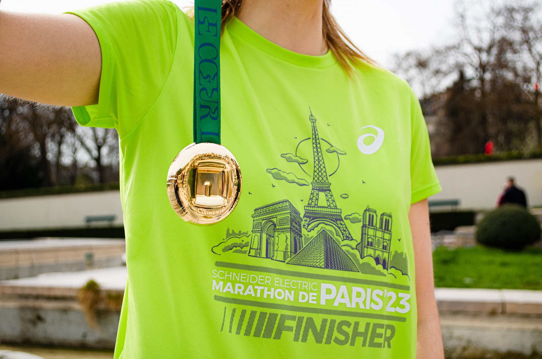 La médaille et le t-shirt finisher du Marathon de Paris 2023