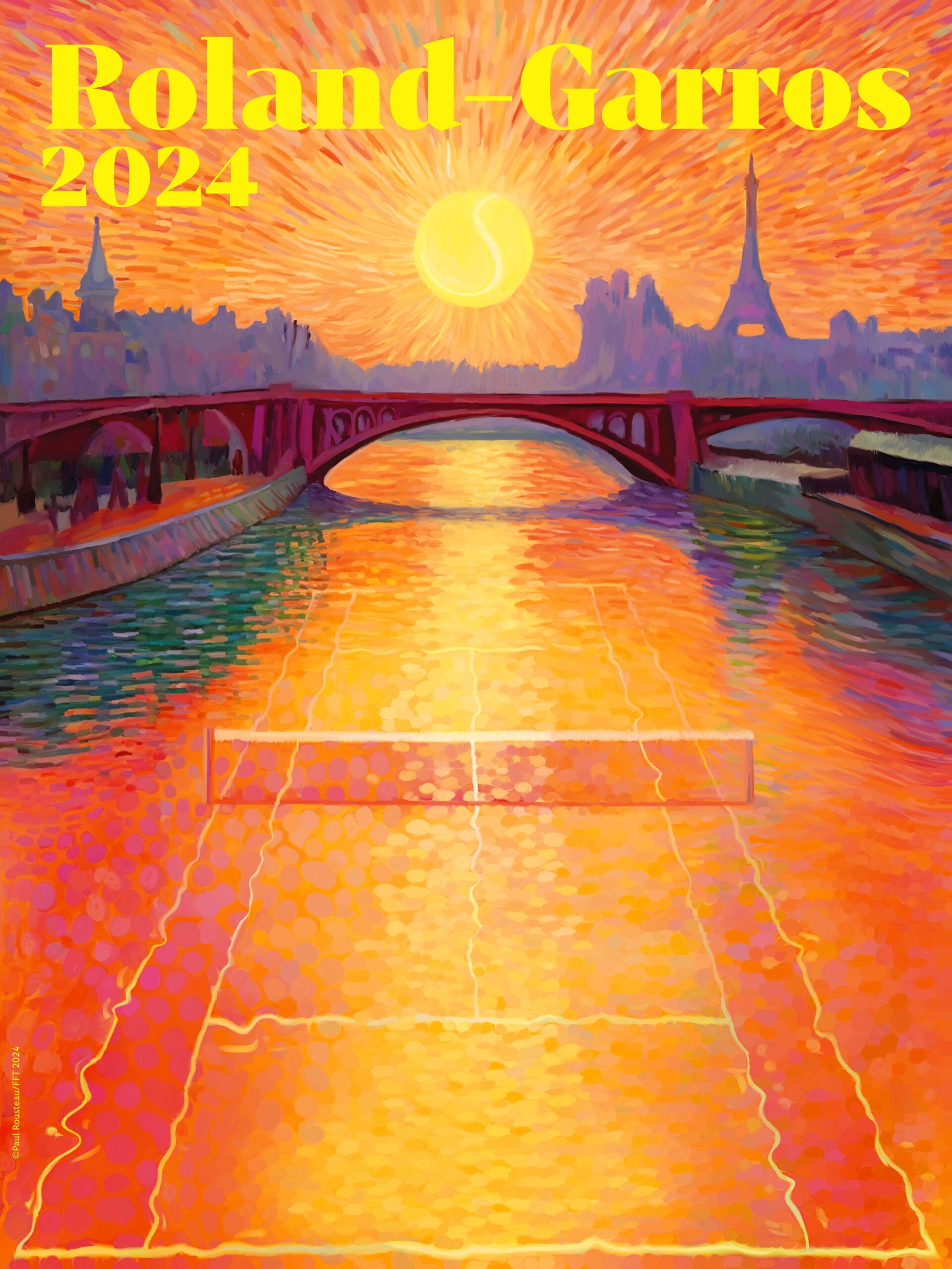 Pour ce poster qui représente un court de tennis sur la Seine, la FFT a retenu l’une des créations du photographe français Paul Rousteau. « L’artiste signe une œuvre à la fois poétique et onirique mais surtout particulièrement innovante et singulière. Il s’est en effet appuyé sur l’intelligence artificielle (IA) pour la réaliser » précise la Fédération.