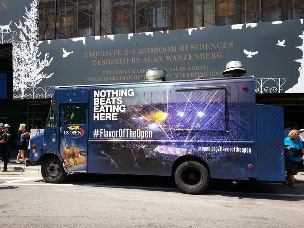 La baseline du tournoi « Nothing beats being here » (rien ne vaut d’être ici) a pour l’occasion été remplacée sur le camion par « Nothing beats eating here » (rien ne vaut de manger ici), sous entendu à l’US Open. Plus qu’un simple évènement sportif, l’US Open – comme la majorité des évènements sportifs – propose un service de restauration varié et de qualité répondant aux attentes des Fans, allant du simple sandwich aux prestations VIP.