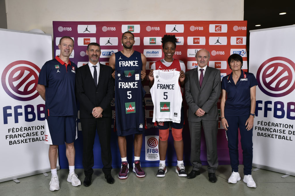 Pour la présentation des nouveaux maillots, Jean- Pierre Siutat, Président de la FFBB, et Dominique Mahé, Président du Groupe MAIF (3,5 milliards d’euros de chiffre d’affaires en 2017), étaient accompagnés des deux entraîneurs des Équipes de France, Vincent Collet et Valérie Garnier ainsi que les capitaines Nicolas Batum et Endy Miyem.