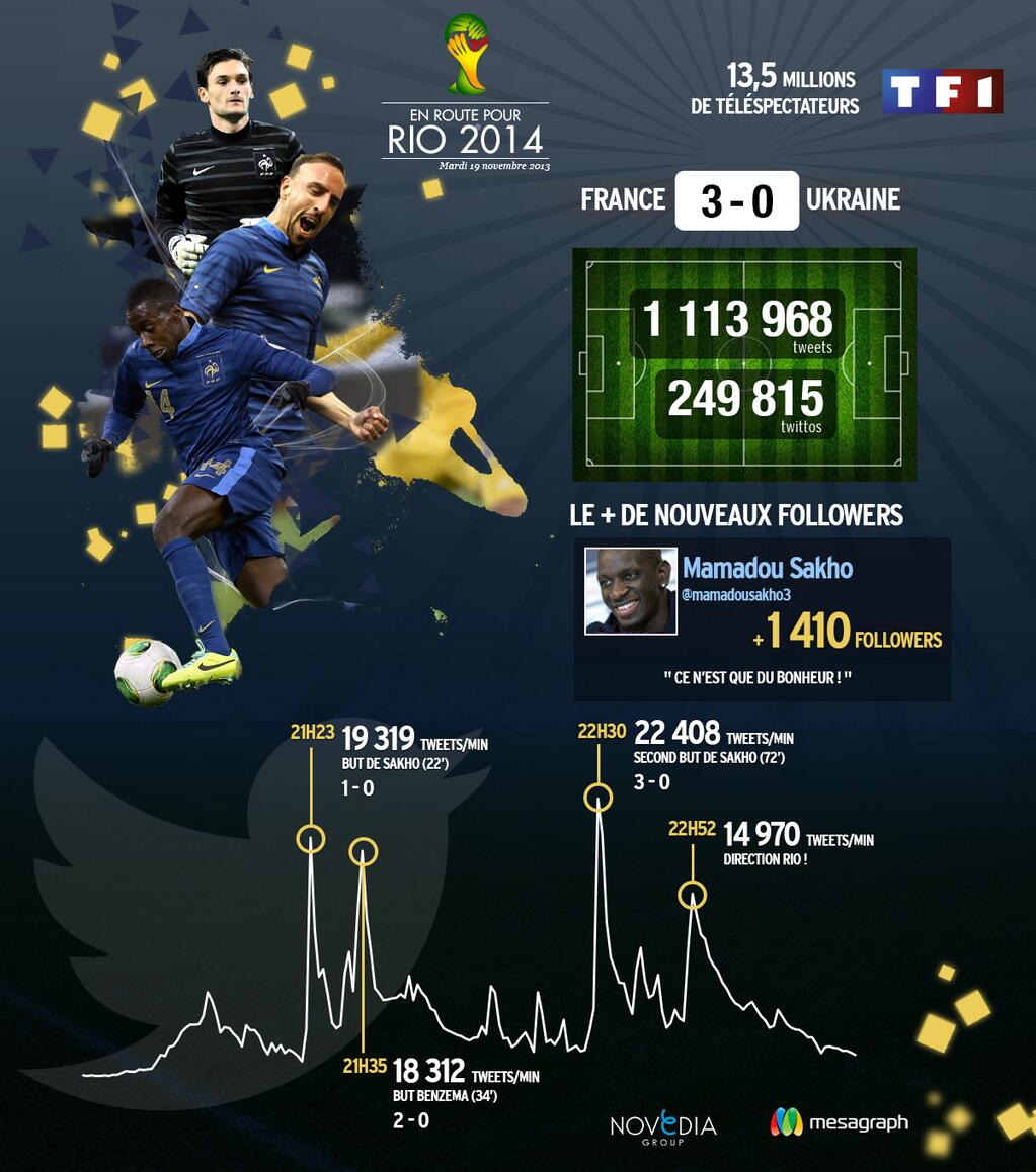 Carton d’audiences pour TF1 avec un pic à 18 millions de téléspectateurs, le match décisif France – Ukraine a également déchaîné une avalanche de commentaires sur les réseaux sociaux. Sur Twitter, plus d’un million de tweets ont été envoyés pendant la rencontre avec une pointe à plus de 22 000 tweets/minute au moment du troisième but des Bleus. Novedia en collaboration avec Mesagraph a réalisé une infographie résumant la rencontre France – Ukraine sur Twitter. Grâce à son doublé, Mamadou Sakho a gagné un peu plus de 1400 followers dans la soirée. Pour féliciter le défenseur des Bleus sur Twitter, c’est ici : @mamadousakho3.