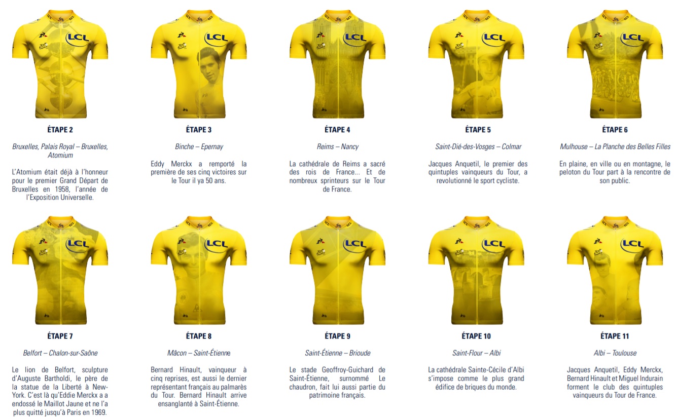 Lors de chaque étape de la 106 édition de la Grande Boucle, le leader du classement général arbore une tunique inédite à l’effigie d’un quintuple champion du Tour de France, d’un fait lié à l’histoire du Tour ou encore d’un monument représentatif de l’étape du jour (L’Atomium, le Lion de Belfort, le Pont du Gard, la cathédrale d’Albi, Jacques Anquetil, Eddy Merckx, Bernard Hinault, Miguel Indurain, etc.)
