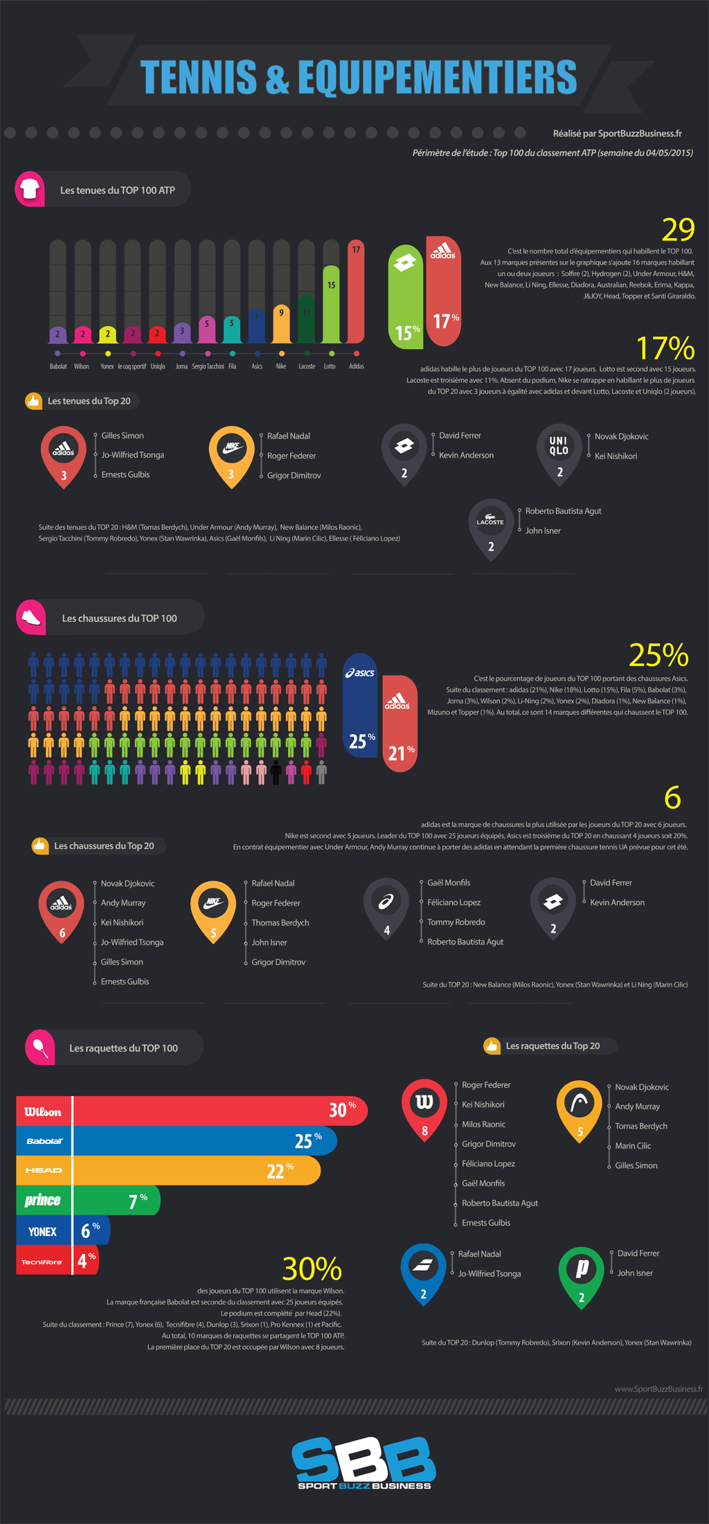 Suite à notre infographie sur les marques présentes dans le TOP 100 ATP, adidas, Asics ou encore Wilson sortaient du lot avec une majorité de joueurs équipés. La marque aux trois bandes habillait 17% d’entre eux devant Lotto et Lacoste. Asics étaient aux pieds de 25% des joueurs du TOP 100 et Wilson dans les mains de 30% d’entre eux.