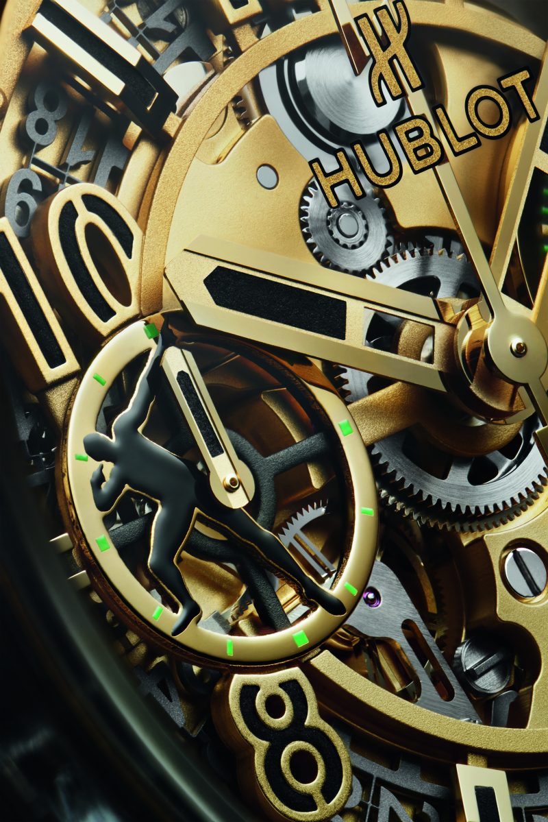Dans un boîtier de 45mm de diamètre, le design de la montre est teinté de vert et d’or sur un bracelet transparent. Cette pièce unique est proposée avec un second bracelet en veau, couleur or jaune, rehaussant la silhouette du drapeau jamaïcain évoquant les origines de l’athlète. Le compteur à 9H porte la silhouette de « Lightning Bolt » et son emblématique signe victorieux. Un cadran squelette taillé dans l’or jaune 3N 18k.