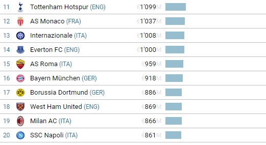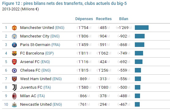 Au jeu de la « balance », soit la différence entre les achats et les ventes de joueurs, c’est le club de Manchester United qui affiche le pire bilan sur 2013-2022 avec -1,269 milliard d’euros. Le podium est complété par Manchester City (-902M€) et le Paris Saint-Germain (-868M€).