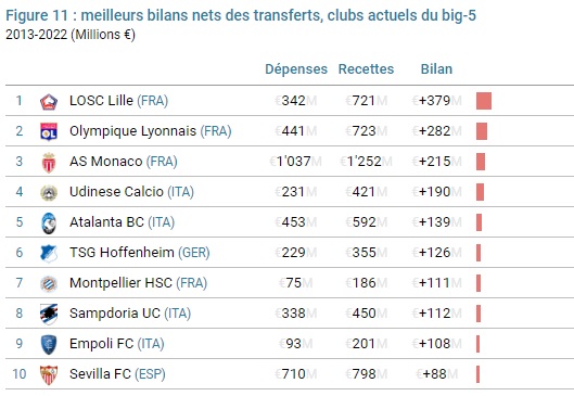 De l’autre côté, « les meilleurs élèves » sont 3 clubs évoluant dans le Championnat de France avec le LOSC (+379M€), l’Olympique Lyonnais (+282M€) et l’AS Monaco (+215M€). Le club du Rocher affiche notamment plus de 1,252 milliard d’euros en vente de joueurs sur les 10 dernières années.