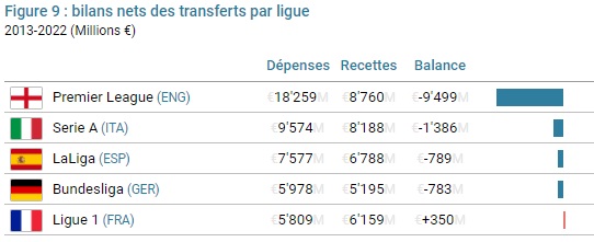 Sur la période 2013-2022, la Ligue 1 et ses clubs affichent ainsi une balance positive de +350 millions d’euros. La Premier League affiche elle un « solde » négatif entre les ventes et les achats de -9,499 milliards euros.