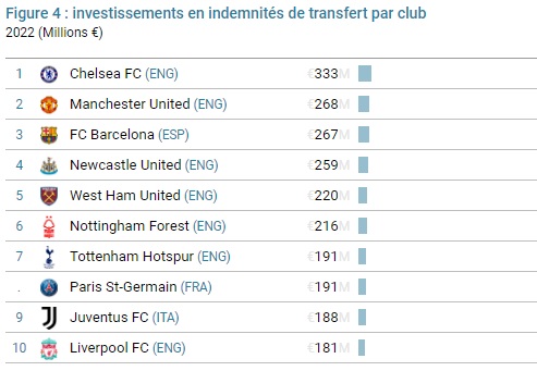 Sur cette année 2022 (hiver+été) uniquement, c’est toujours Chelsea qui domine le classement des sommes déboursées pour acheter des joueurs avec un total de 333 millions d’euros.