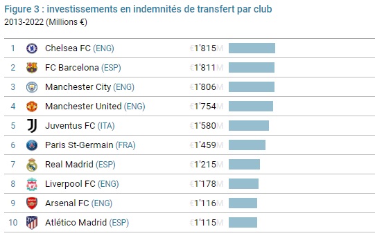 Sur les 10 dernières années, c’est le club anglais de Chelsea FC qui a dépensé le plus en indemnités de transfert avec un montant estimé à 1,815 milliard d’euros entre 2013 et 2022. Le podium est complété par le FC Barcelone et Manchester City qui font pratiquement jeu égal avec les Blues.