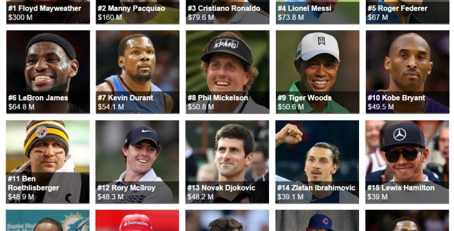 Comme chaque année, le magazine américain Forbes publie son classement des sportifs qui ont gagné le plus … Lire la suite de 3,2 milliards de dollars pour les 100 sportifs les mieux payés ces 12 derniers mois selon Forbes dont 300M$ pour Mayweather