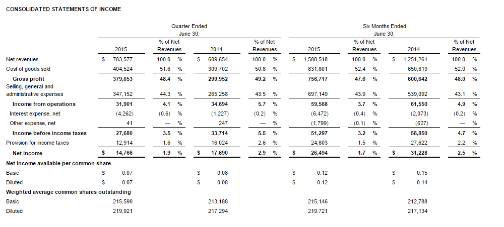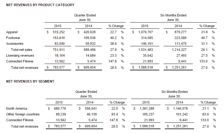En effet les ventes ont augmenté de plus de 29% par rapport à l’année précédente pour atteindre les 784 millions de dollars sur la période Avril/Mai/Juin 2015. Du côté des bénéfices, ils ont diminué de 17% au second trimestre avec 14,7M$ contre 17,6M$ à la même période l’année passée. Les investissements marketing plus importants peuvent expliquer un recul du résultat net. Dans le détail, les revenus issus du textile progressent de 23% (515M$). Nul doute que la récente éclosion du golfeur Jordan Spieth permette à Under Armour de poursuivre ses ventes.
