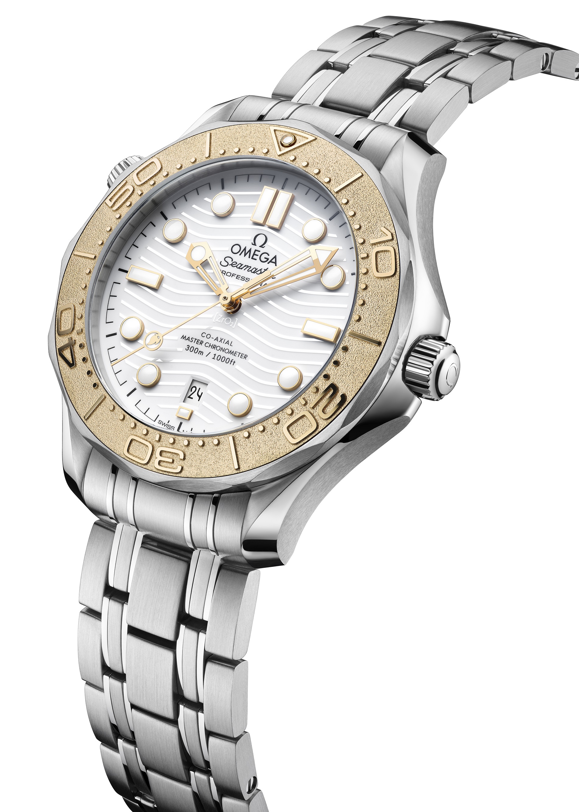 « Cette montre est fabriquée en acier inoxydable et en or 18K Moonshine, l’alliage d’or jaune propre à OMEGA, qui offre une teinte plus subtile ainsi qu’une grande résistance à la décoloration » détaille la marque. « En tant que garde-temps des Jeux Olympiques, l’utilisation de l’or rappelle les médailles convoitées que chaque athlète s’efforce d’obtenir. L’or a été utilisé pour la lunette de la montre, qui présente une échelle de plongée structurée au laser en relief positif, ainsi qu’un point de Super-LumiNova à 12 heures ».