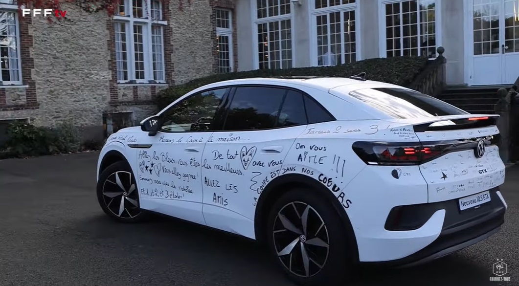 Pour ce dernier rassemblement des Bleus sélectionnés pour la Coupe du Monde 2022, Volkswagen a offert la possibilité à certains supports d’inscrire des messages d’encouragement sur des véhicules de la gamme iD. Il y a quelques jours, la youtubeuse Sam FootX est allée dans 4 clubs amateurs pour que les jeunes licenciés dédicacent des voitures.