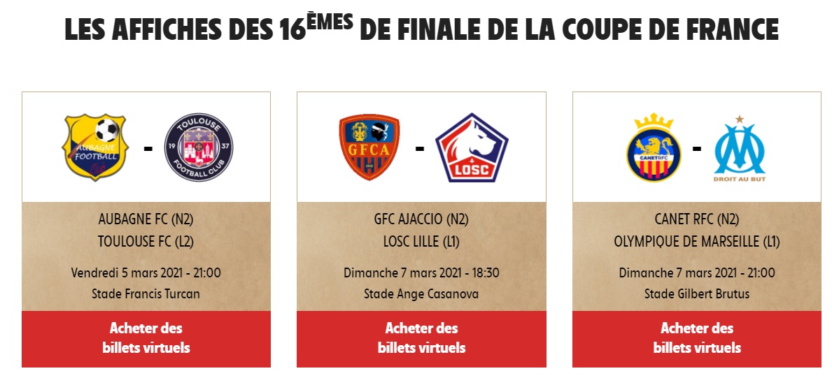 Pour certains matchs de Coupe de France programmés le week-end prochain (6 et 7 mars), Intermarché propose donc aux fans de foot d’acheter des billets virtuels à 5 euros l’unité. L’intégralité de la somme récoltée sera reversée aux clubs qui participent à cette opération, à savoir Aubagne FC (vs Toulouse), le GFC Ajaccio (vs LOSC) et Canet RFC (VS OM).