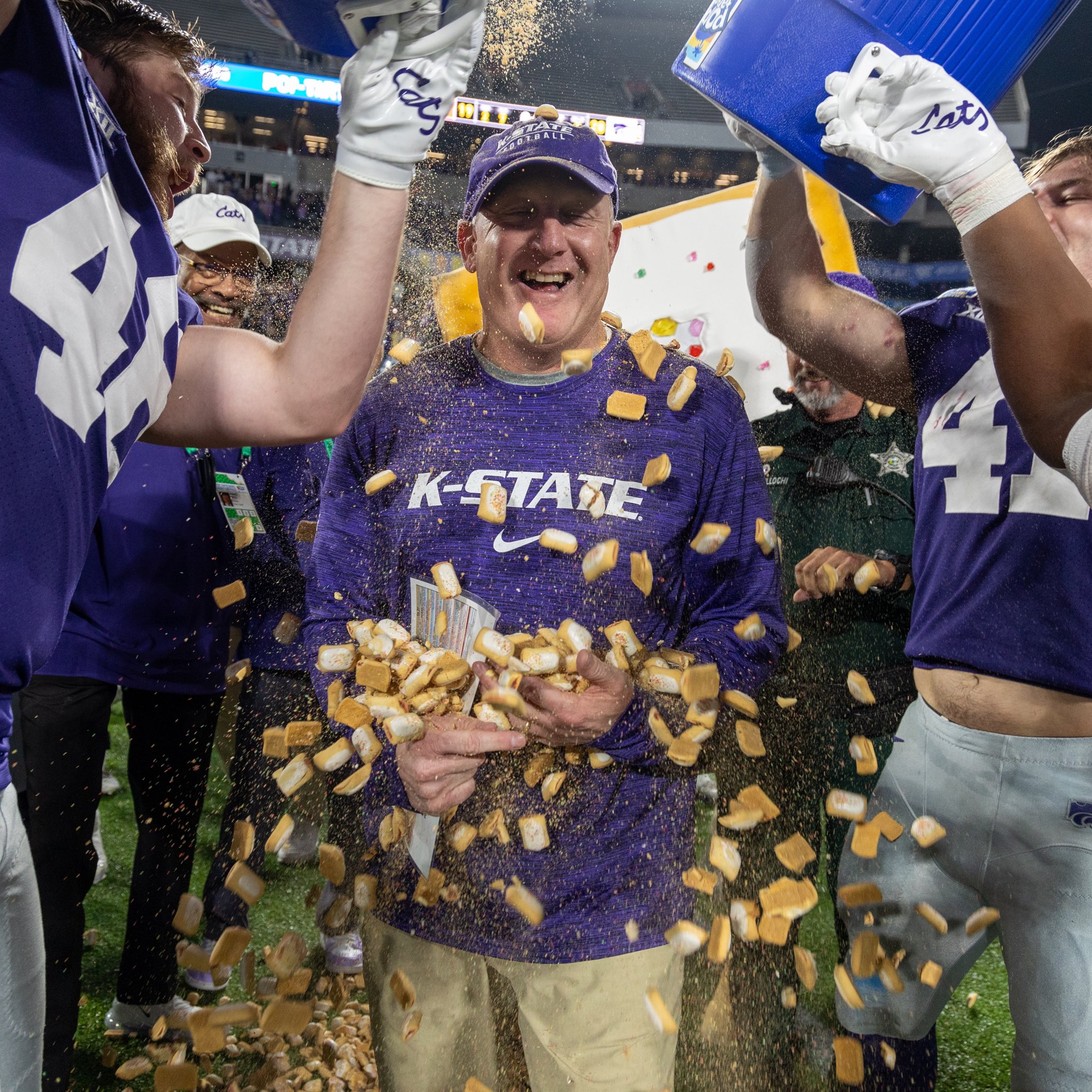 A la manière du Gatorade, c’est une pluie de mini biscuits qui a été versée sur le coach de Kansas.