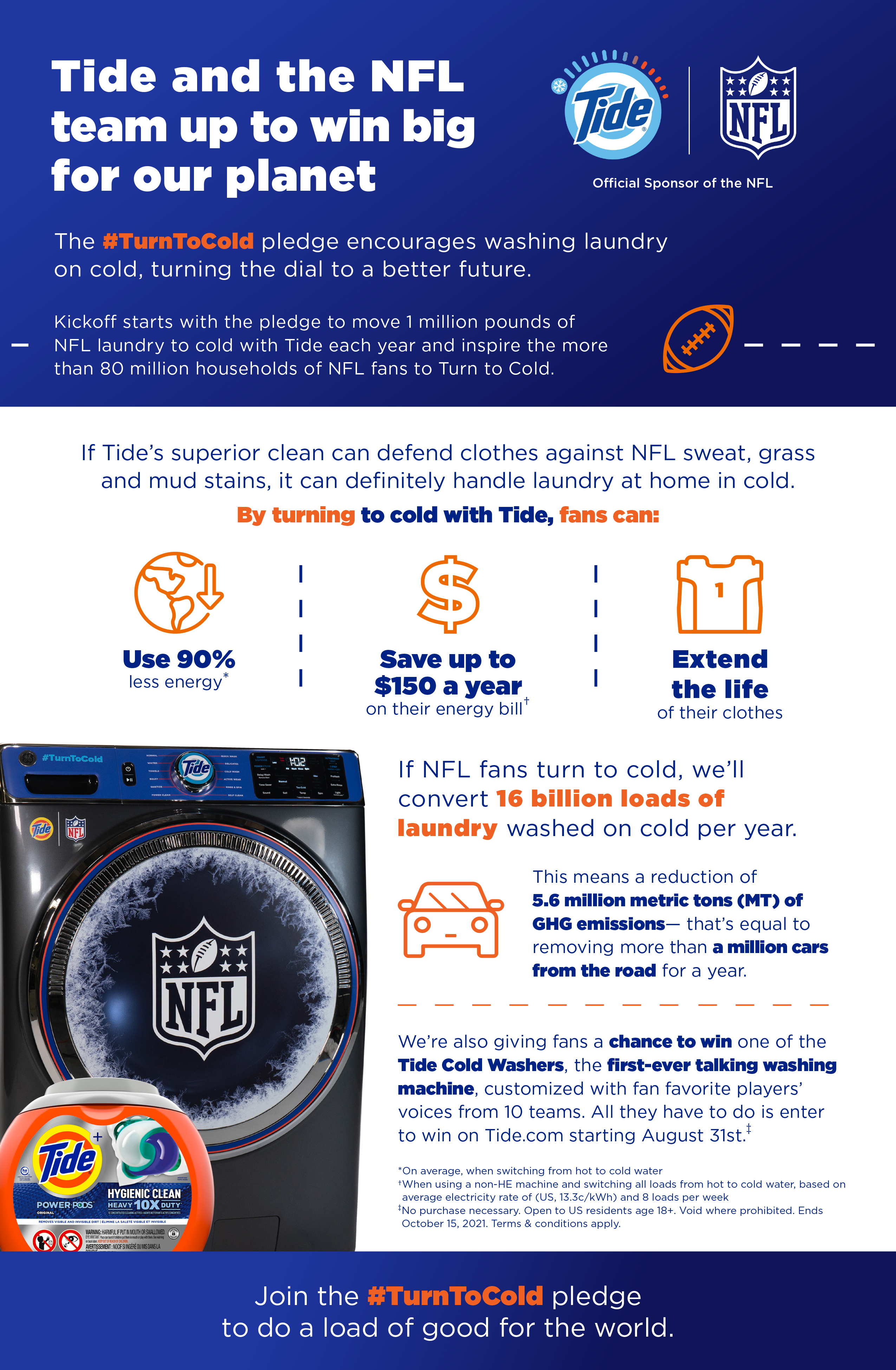 Partenaire de la NFL, la marque de lessive Tide lance une campagne visant à motiver les fans de passer au lavage à l’eau froide pour des raisons environnementales et économiques.