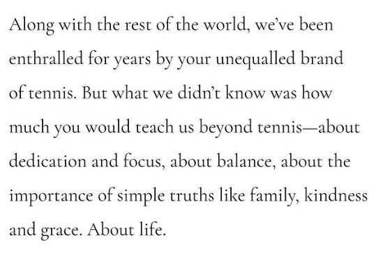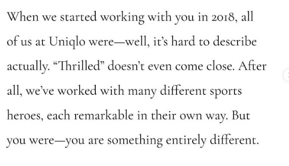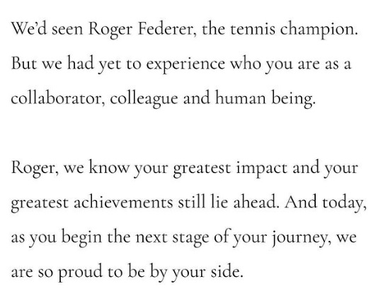 Equipementier textile de Federer depuis 2018, Uniqlo a également pris la parole et salué son ambassadeur à travers une lettre partagée sur les réseaux sociaux. En 2017, la marque japonaise avait déjà rédigé une lettre pour remercier Novak Djokovic qui partait chez Lacoste.