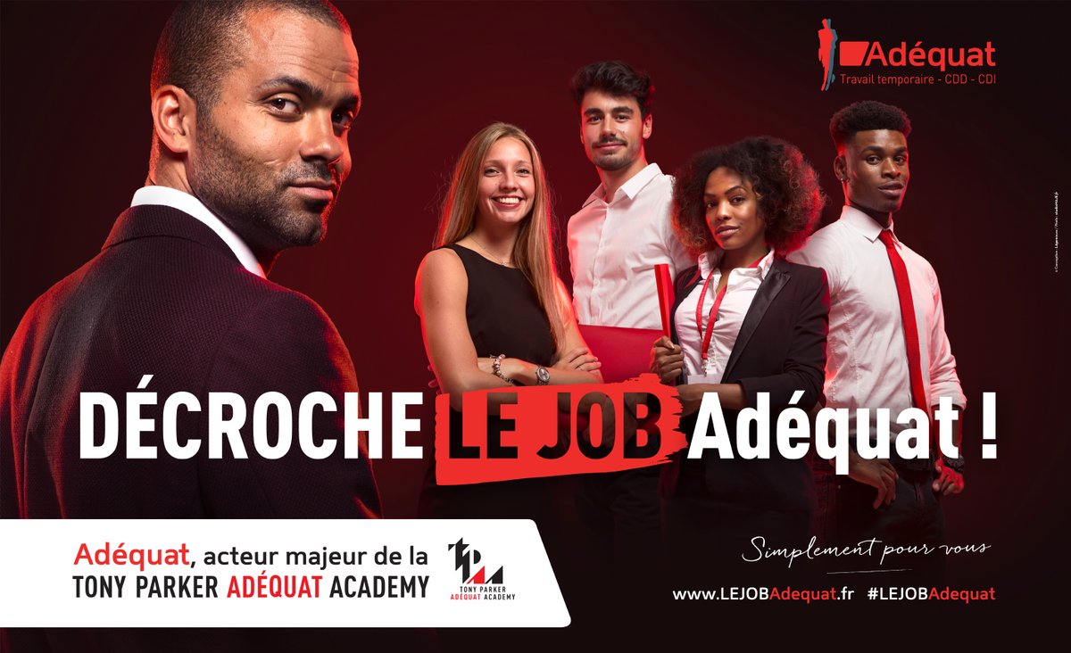 Pour cette campagne signée Sport Plus Conseil (agence appartenant à Gaëtan Muller, agent de Tony Parker), le joueur NBA des San Antonio Spurs est placé comme le meneur d’une équipe de jeunes travailleurs. La signature « Simplement pour vous » et le hashtag #LEJOBAdequat accompagnent le dispositif qui vise à faire connaître le site LEJOBAdequat.com sur lequel les candidats peuvent « Shooter leur CV » et obtenir en direct des annonces qui correspondent à leur profil.