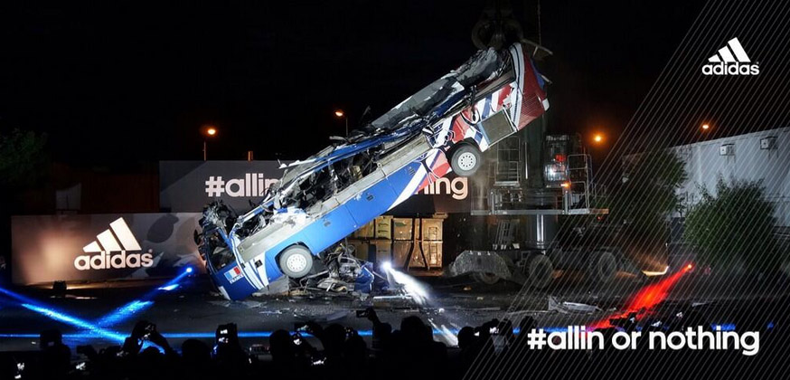 Raser le passé pour écrire le futur. #allin or nothing by @adidasFR qui détruit le bus des #Bleus ! pic.twitter.com/78BNhUU2nQ