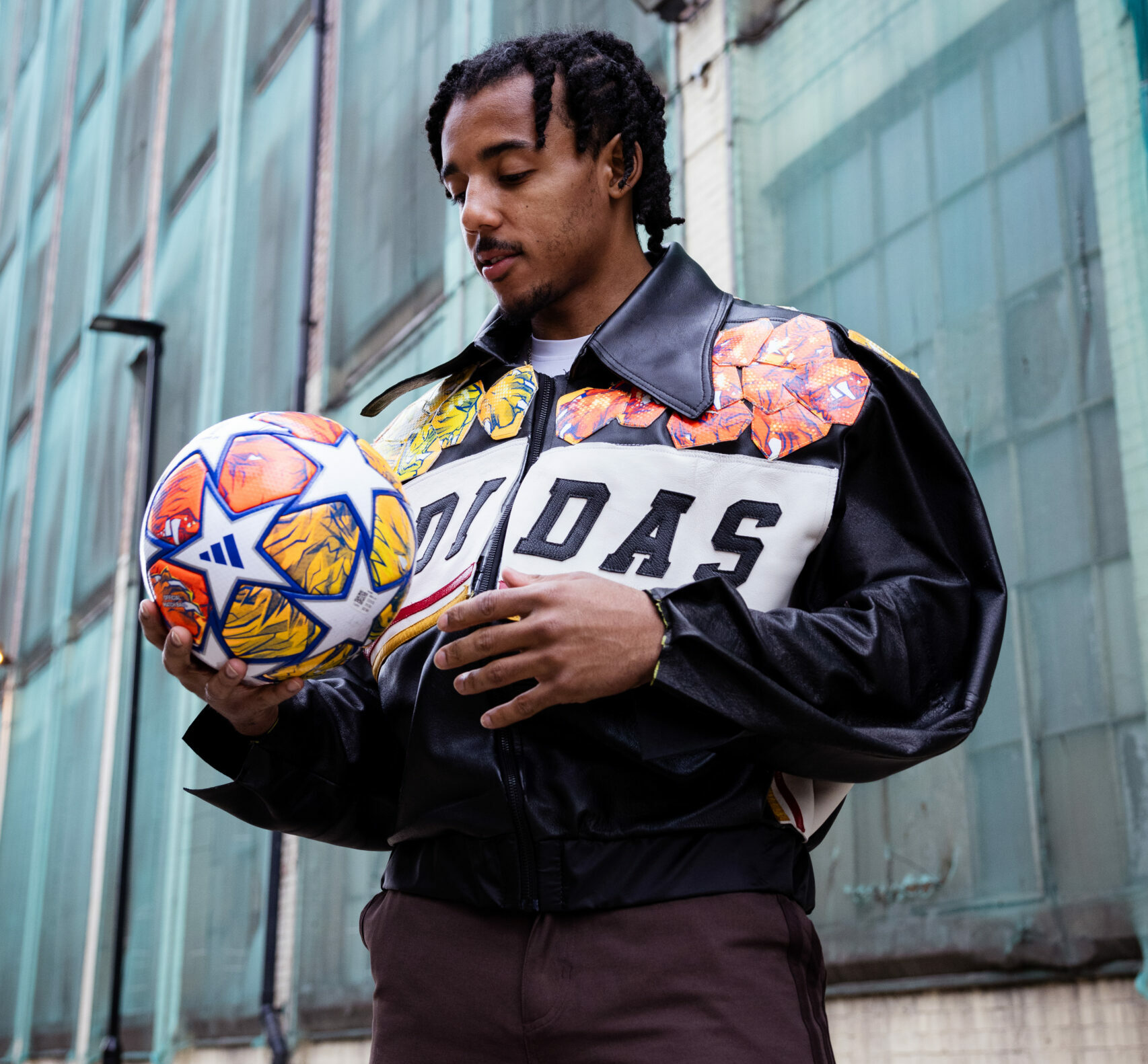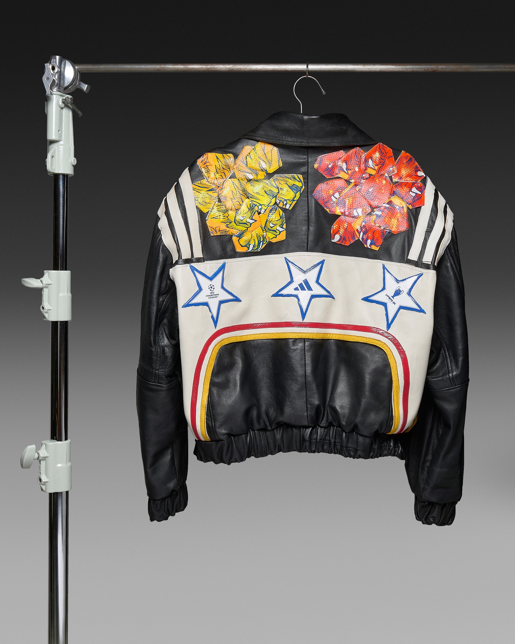 La pièce phare de la collection, la veste UCL Pro Ball London, met en avant des panneaux déconstruits du ballon, permettant à ses lions emblématiques de briller. Fabriquée à partir de vestes en cuir de seconde main, chaque pièce a été méticuleusement coupée, nettoyée et réassemblée dans un style bomber, inspiré des années 80.