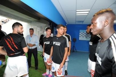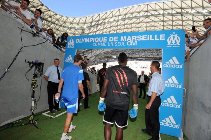 Pour les matchs de l’Olympique de Marseille, les joueurs olympiens revêtaient une tenue d’échauffement arborant la griffe de la Predator Instinct.