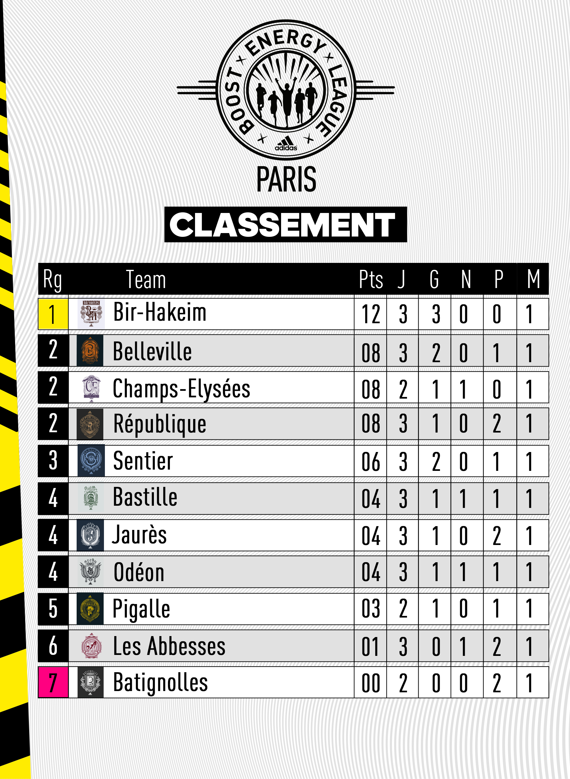 Au classement général, après ces 3 premières journées et en tenant compte du premier multirun, #BoostBirHakeim est en tête, devant #BoostBelleville, #BoostChampsElysees (nouveau venu cette saison). La Team #BoostBastille, tenante du titre de la Boost Battle Run, n’est que 4ème pour moment.