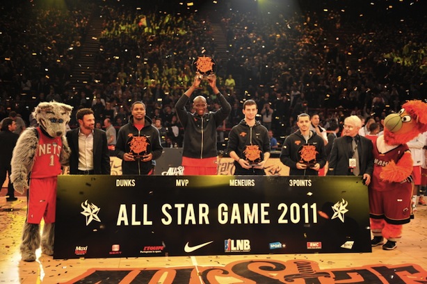 Le All Star Game de basket en France est un véritable « show » et la soirée est rythmée d’animations, comme le tir à 100 000 euros. Un spectateur est tiré au sort pour tenter sa chance sur le parquet. Le tir à 100 000 euros a eu lieu la première fois lors du All Star Game de 2003. Cette animation a été reprise à chaque édition depuis celle de 2007. Heureusement pour les organisateurs (la LNB et Nike), aucun gagnant pour le moment. Nous avons voulu savoir comment était financé ces 100 000 euros ? Est-ce un sponsor qui est associé à cette animation ? Non. L’organisation de l’évènement souscrit un contrat d’assurance spécifique qui interviendrait pour le paiement des 100 000 euros en cas de réussite du candidat nous répond la LNB. Un « petit risque » à prendre mais l’année prochaine, le gros lot va tomber ! Nous vous rappelons que nous faisons gagner 5 T-Shirts Nike du All Star Game 2011 sur notre page Facebook, bonne chance !