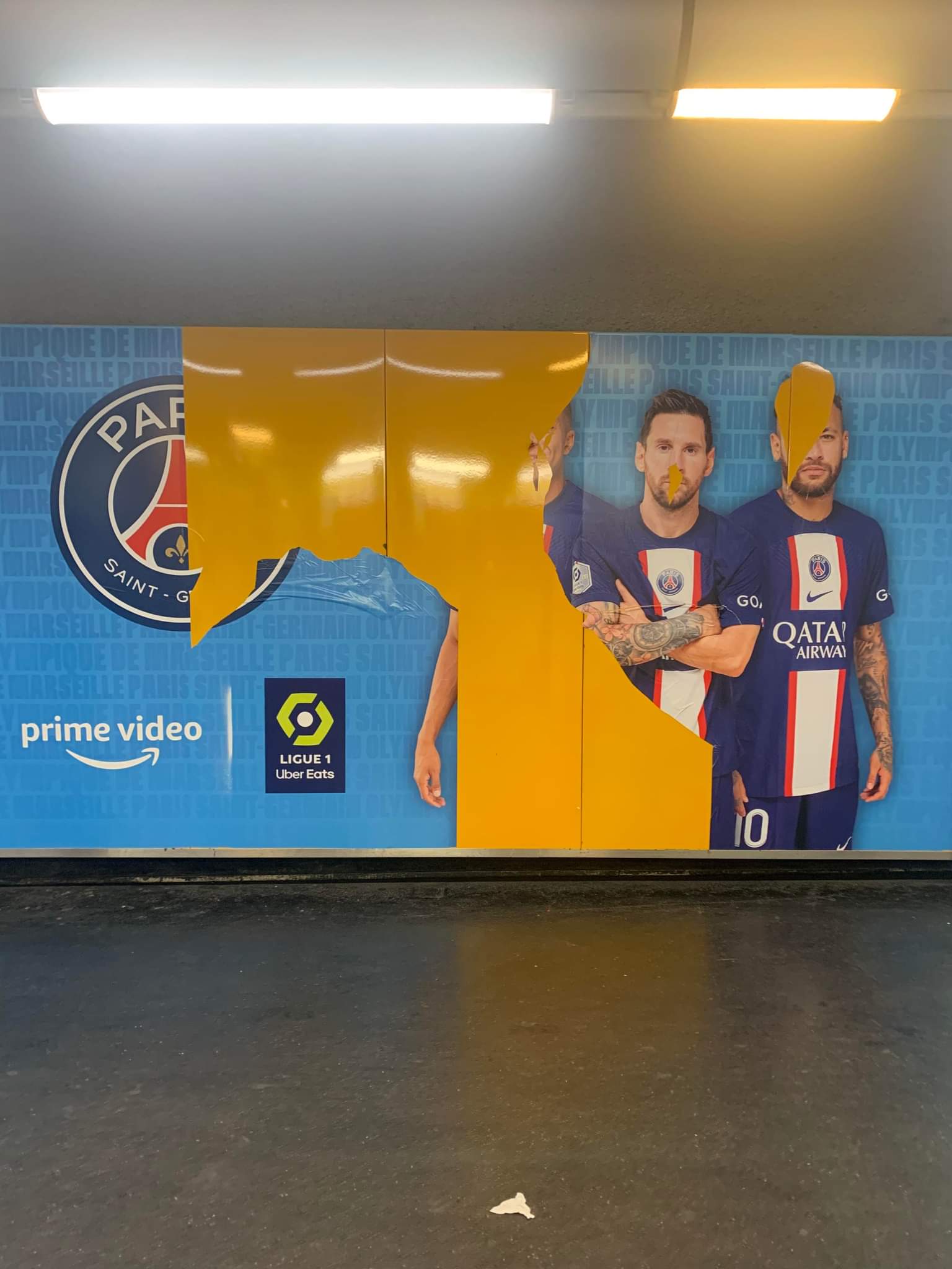 Une campagne qui affiche notamment le logo du Paris Saint-Germain ainsi que certains joueurs comme Kylian Mbappé, Lionel Messi et Neymar à la station de métro Rond-point-du-Prado située à l’Orange Vélodrome.