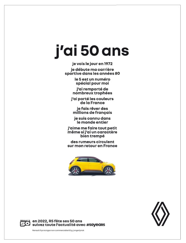 L’occasion pour le constructeur automobile français de rappeler que la R5 (Renault 5) est née en 1972 et célèbre elle aussi ses 50 ans. Une campagne d’ambush marketing puisque Renault n’est pas partenaire de Zinédine Zidane. Bien évidemment, Renault n’utilise jamais le nom de l’ancien numéro 10 des Bleus dans sa prise de parole.